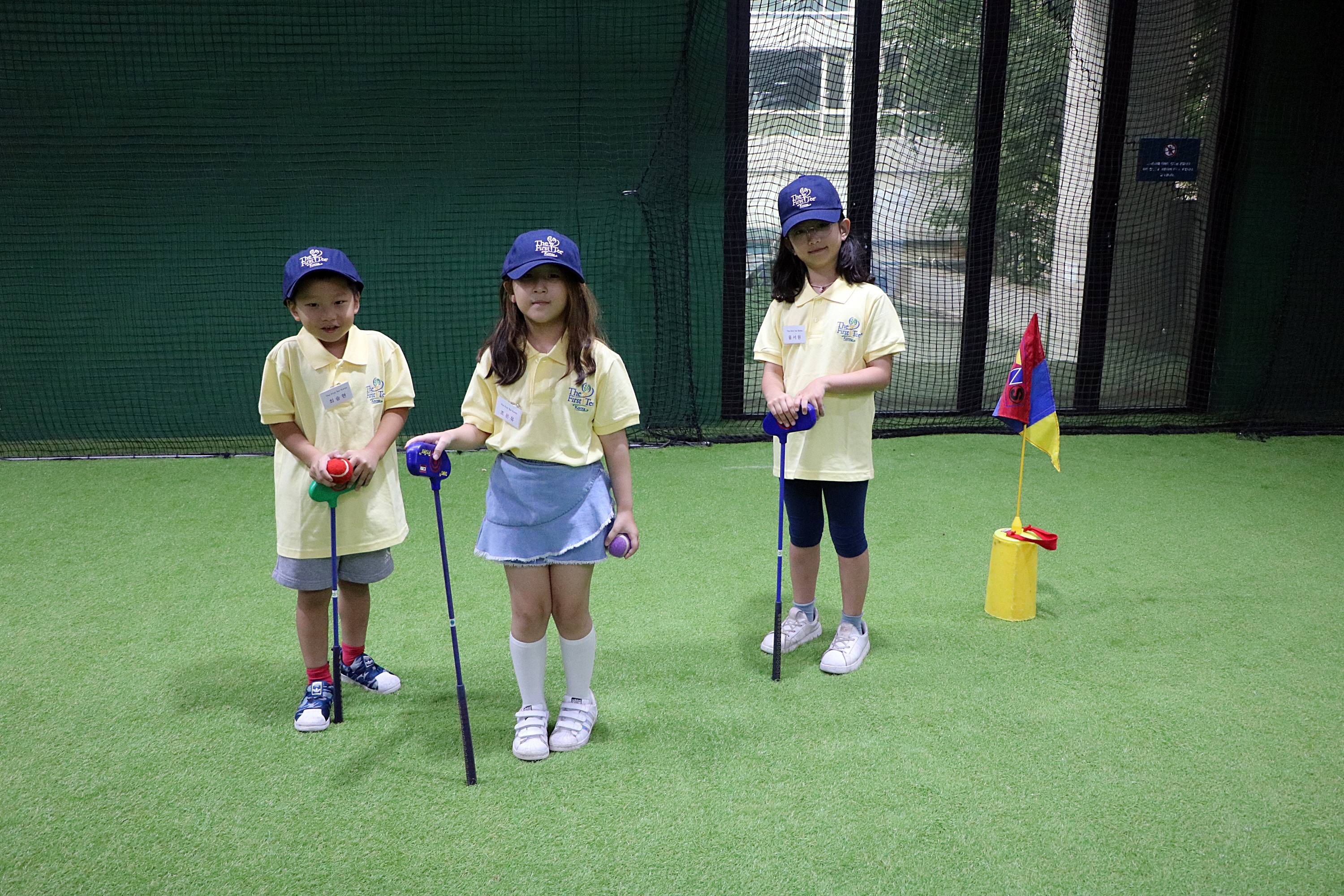 안전을 위해 항상 이동시 또는 쉴 때는 클럽헤드를 잡고 있어야 하는 규칙을 지키고 있는 초보골퍼들
