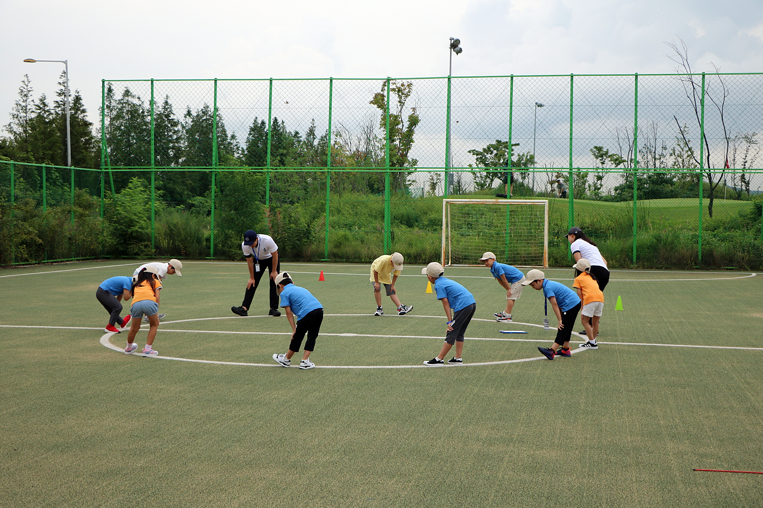 본격적인 골프실습에 앞서 다리운동을 하고 있는 아이들