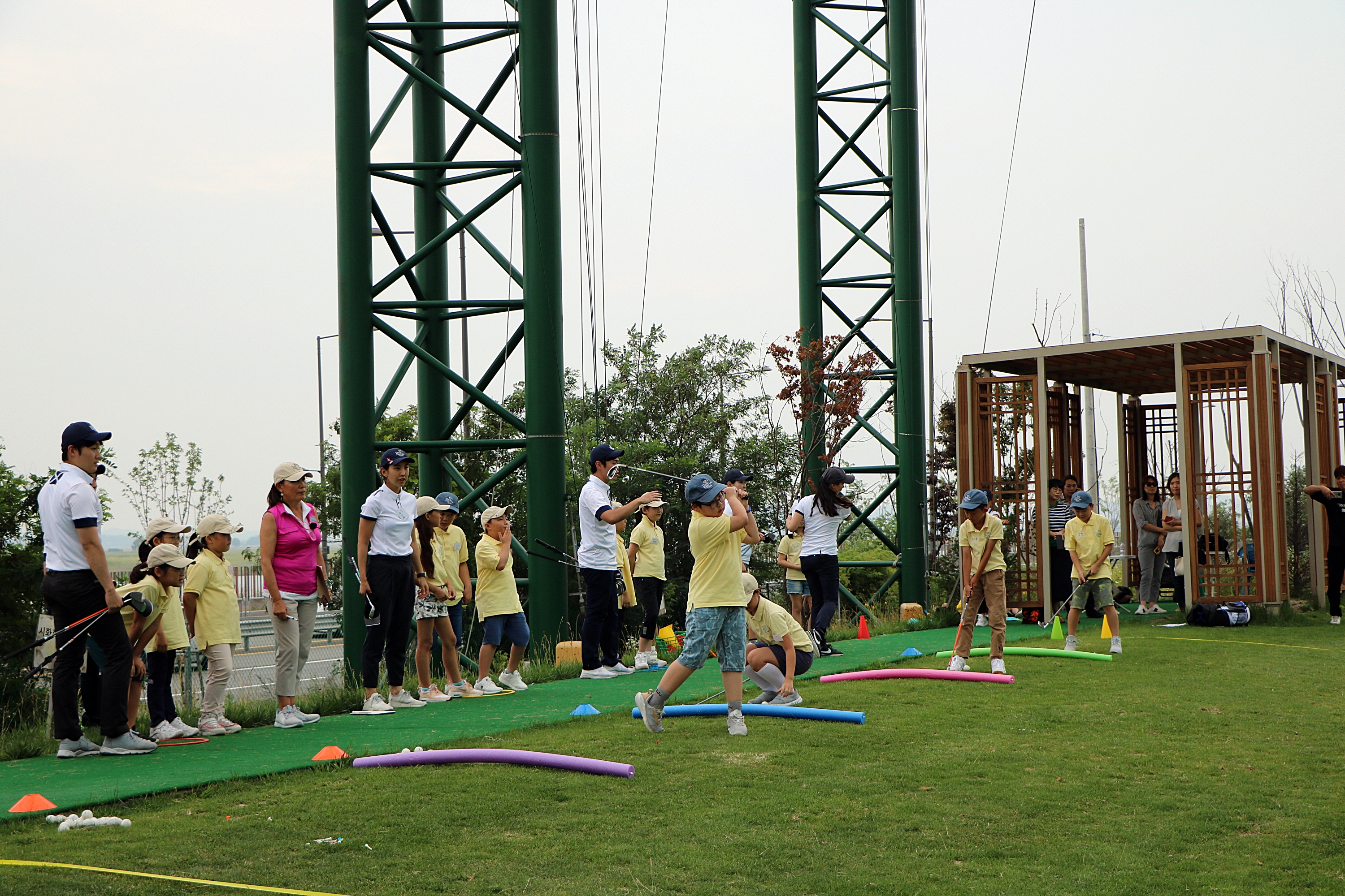 목표지점에 맞게 클럽을 선택한 뒤 스윙 실습을 하고 있는 아이들