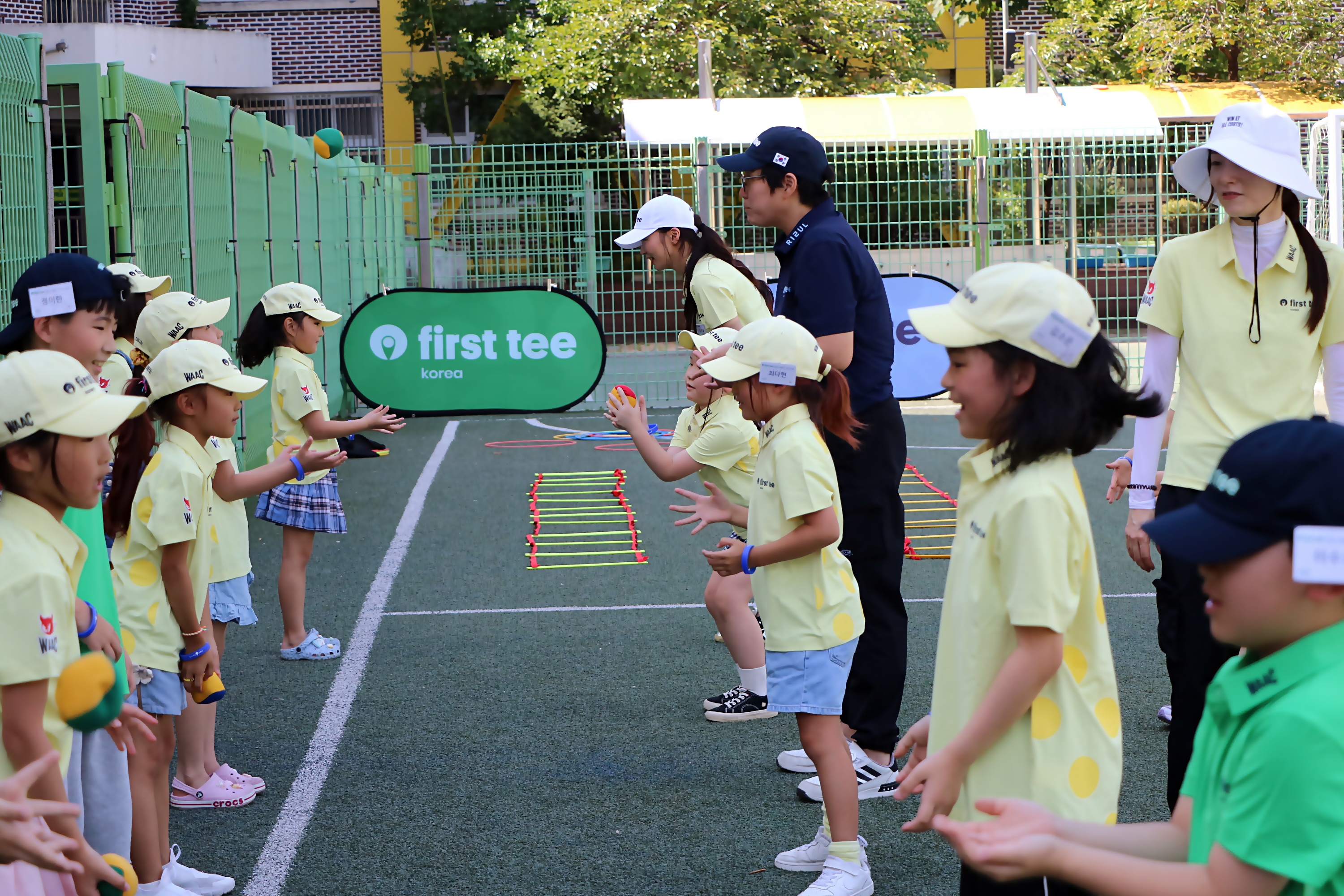 집중력을 향상시키기 위해 공주고받기 게임을 하며 몸을 풀고 있는 아이들