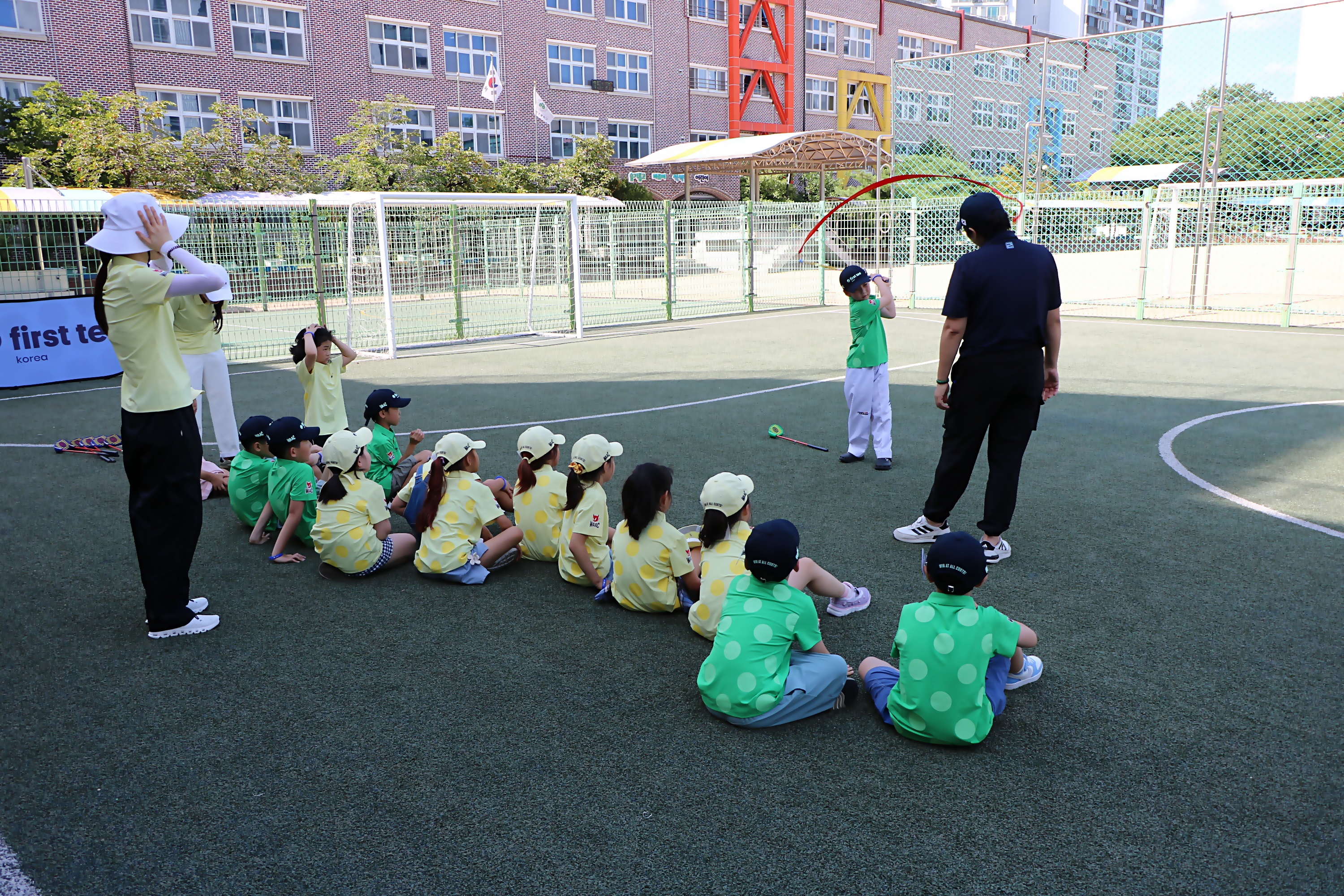 리본이 달린 스윙연습도구를 가지고 골프스윙의 기본원리에 대해서 배우고 있는 아이들
