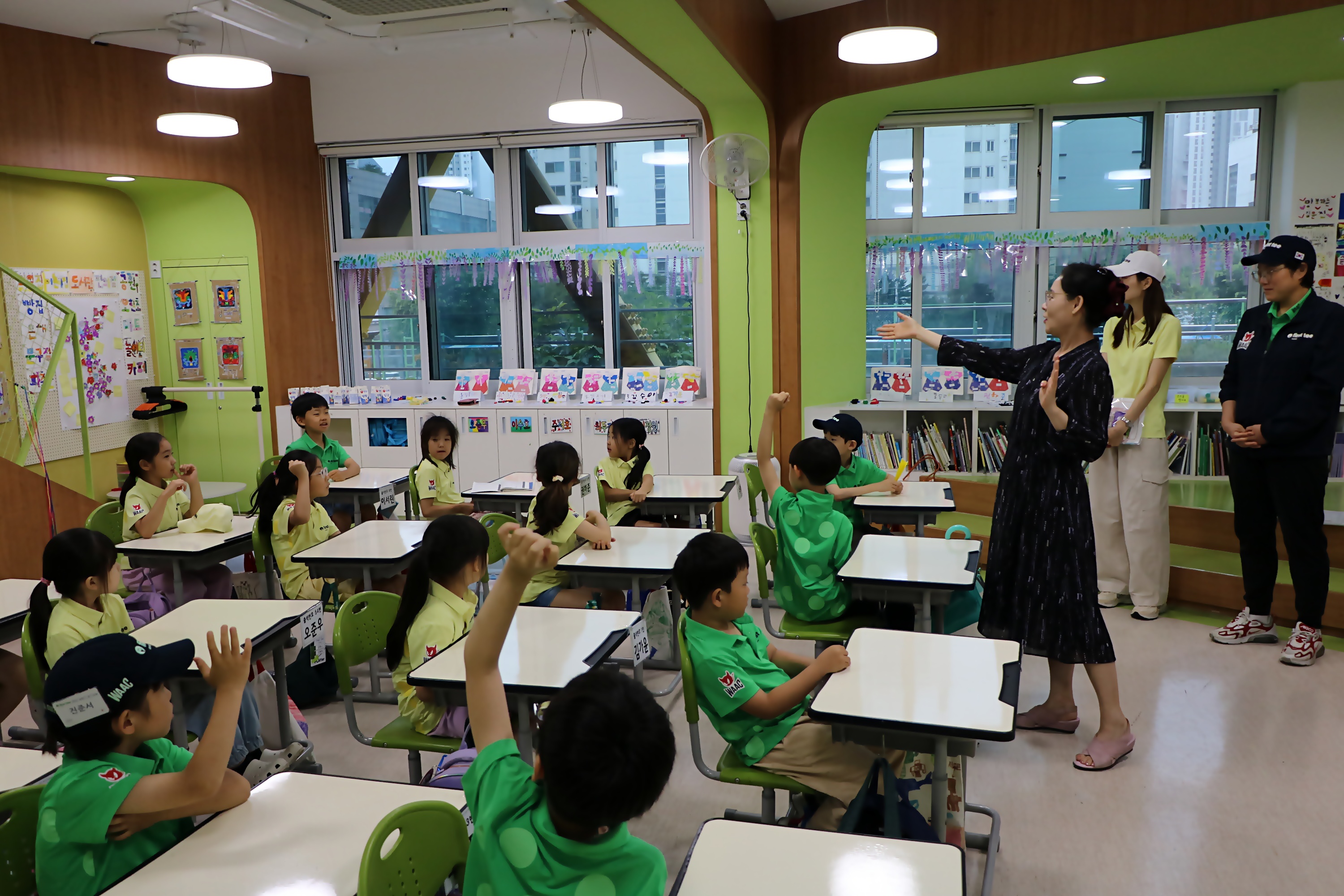 10주간 배운 내용에 대해 교장선생님께서 질문하시자 이에 대해 서로 손을 들어 먼저 발표하려는 아이들