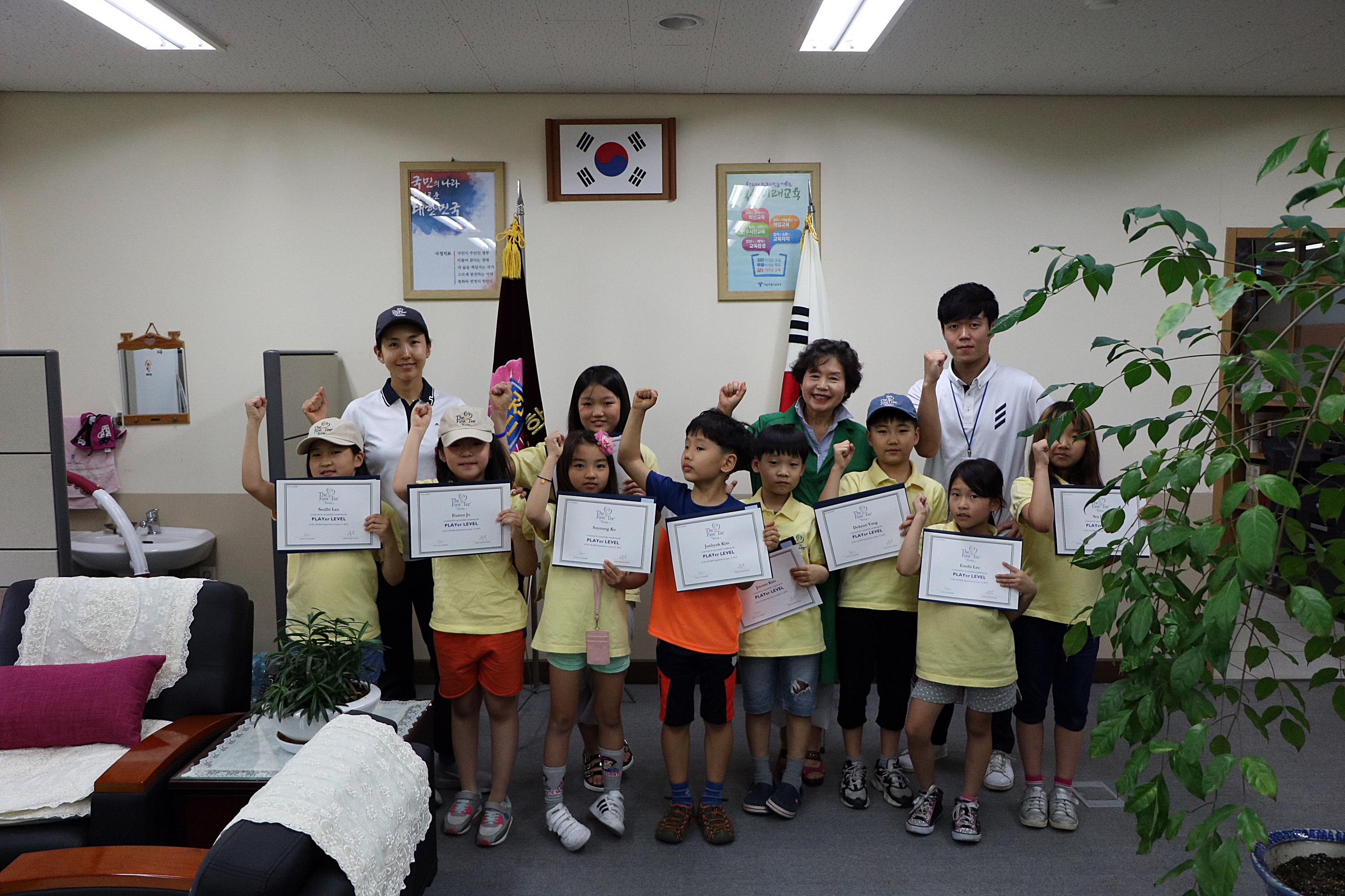 화이팅을 외치며 수료증을 들고 환하게 웃고 있는 수료생들