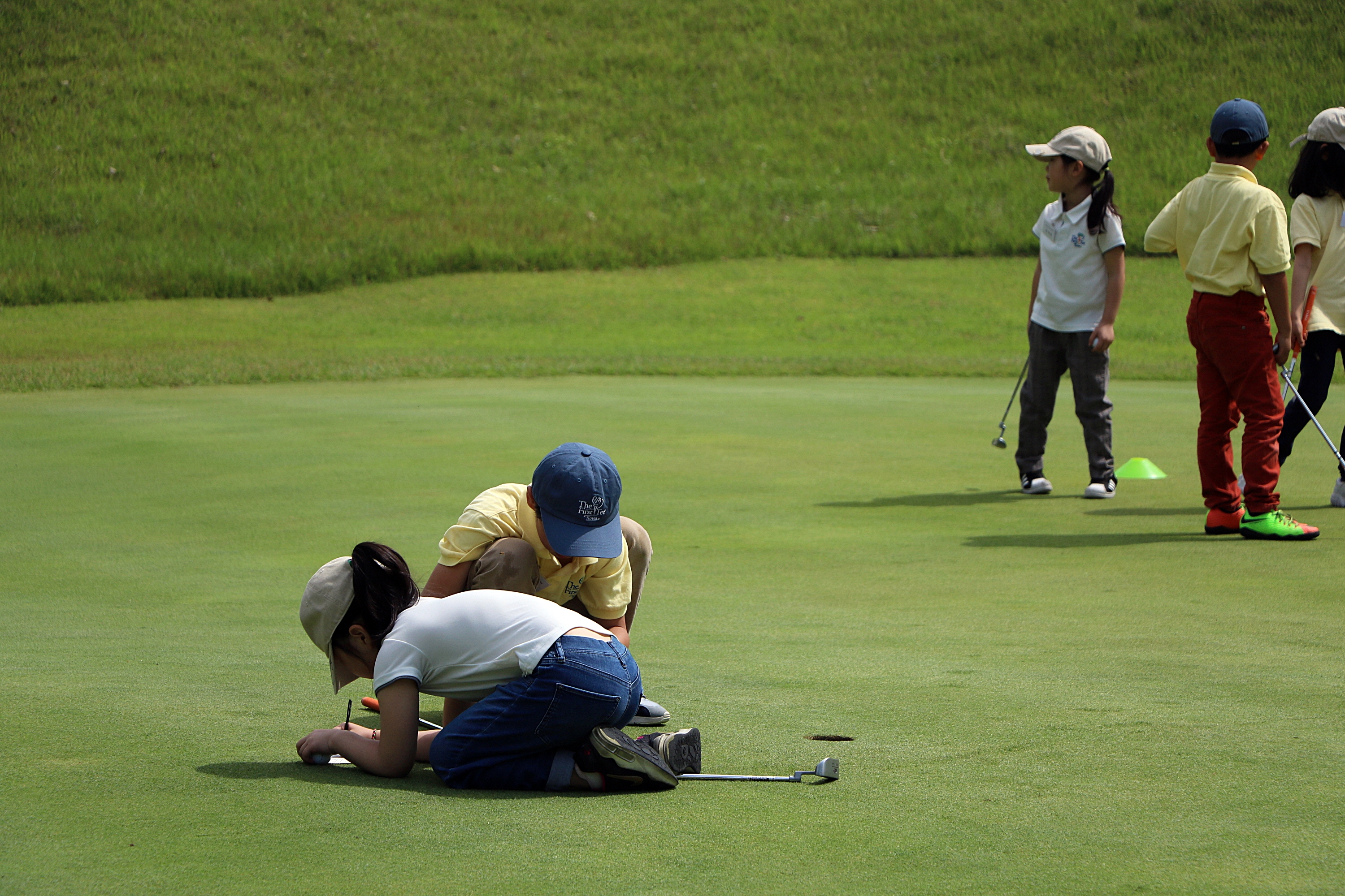 그린 위를 책상 삼아 스코어카드를 작성하고 있는 아이들