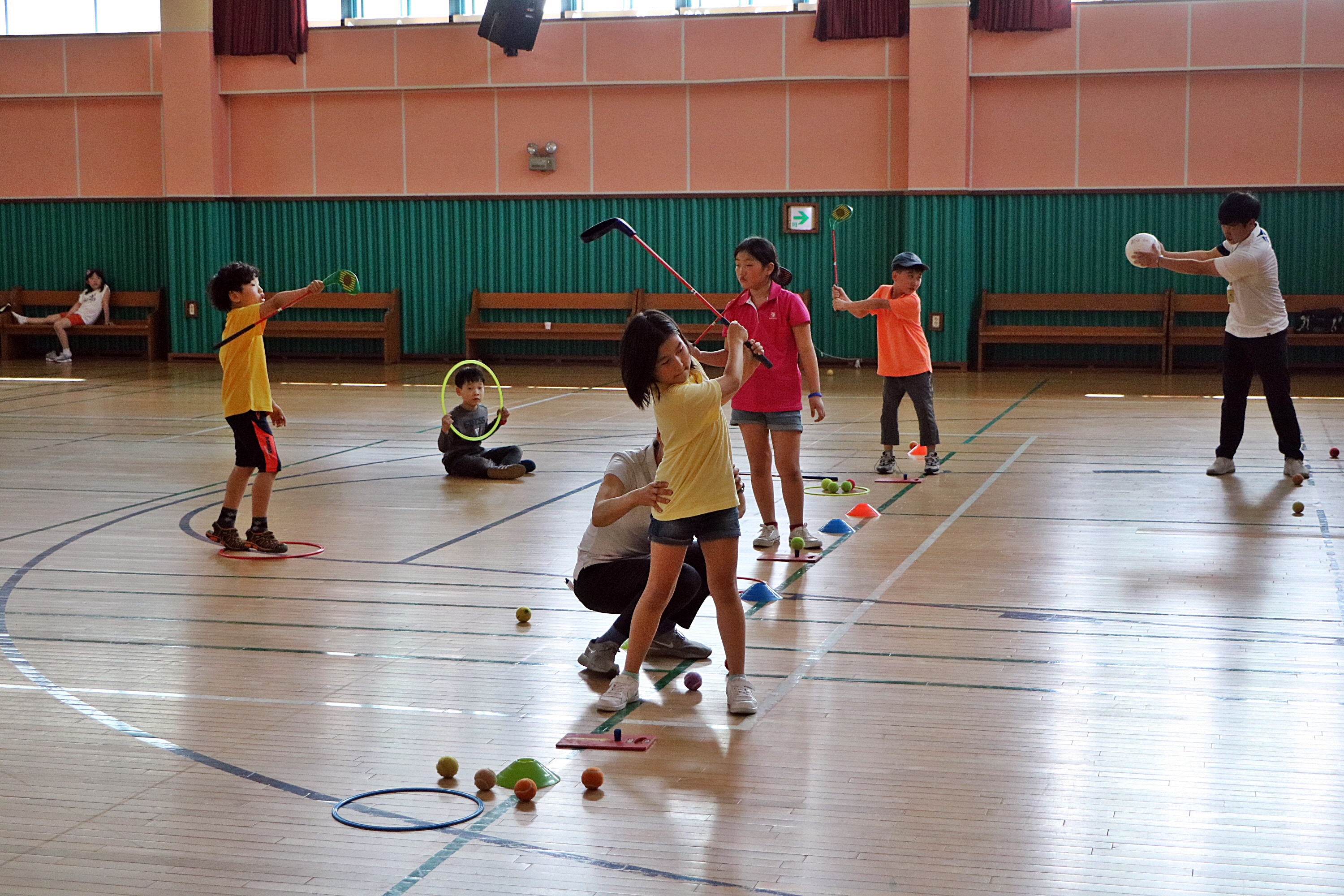 스윙시 몸통이 흔들리지 않도록 자세를 교정해 주고 있는 모습