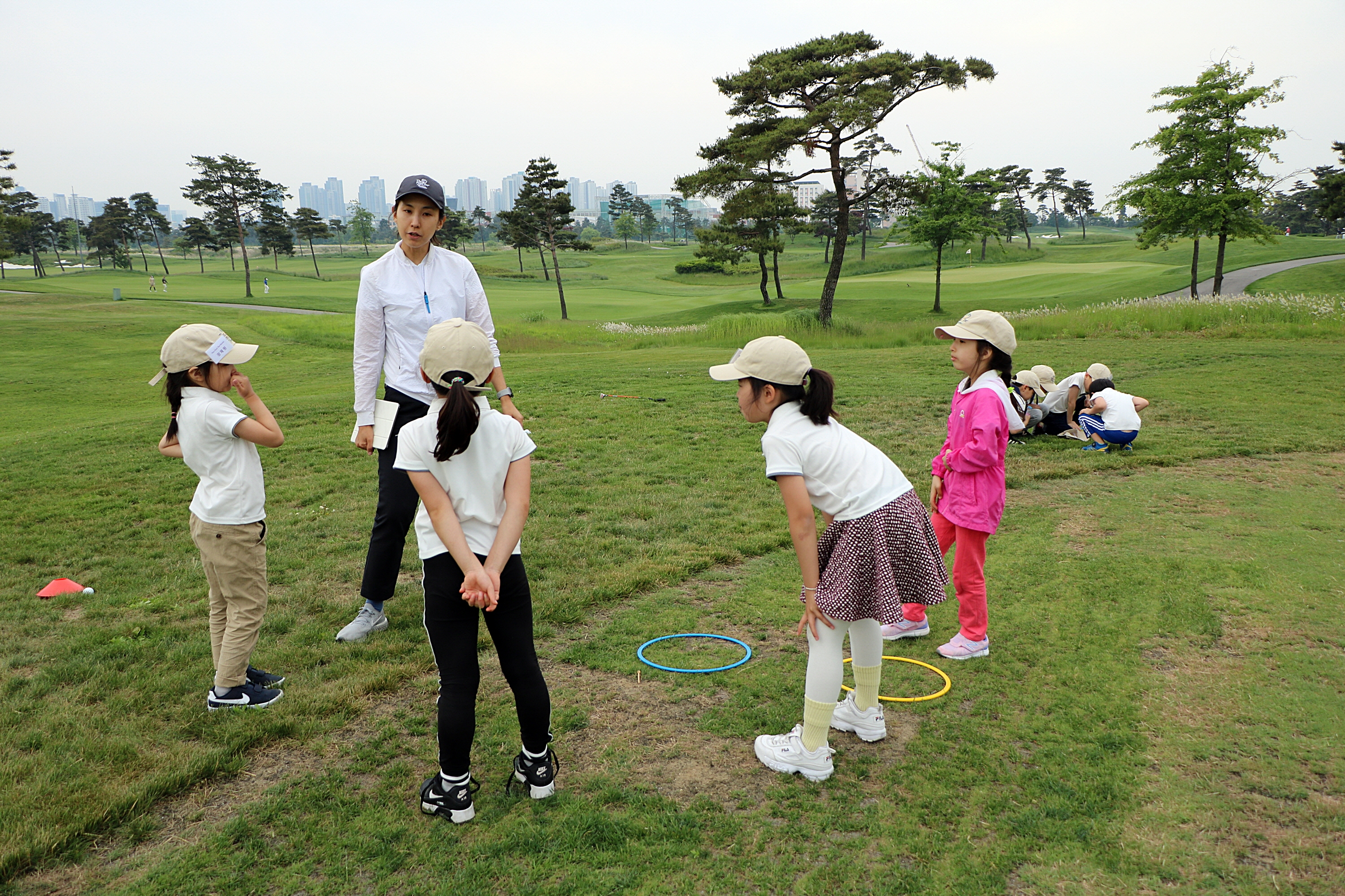 개인별로 스윙동작에서 수정해야 할 내용을 알려준 뒤 그것을 정확하게 알고 있는지 리뷰해주고 있는 모습