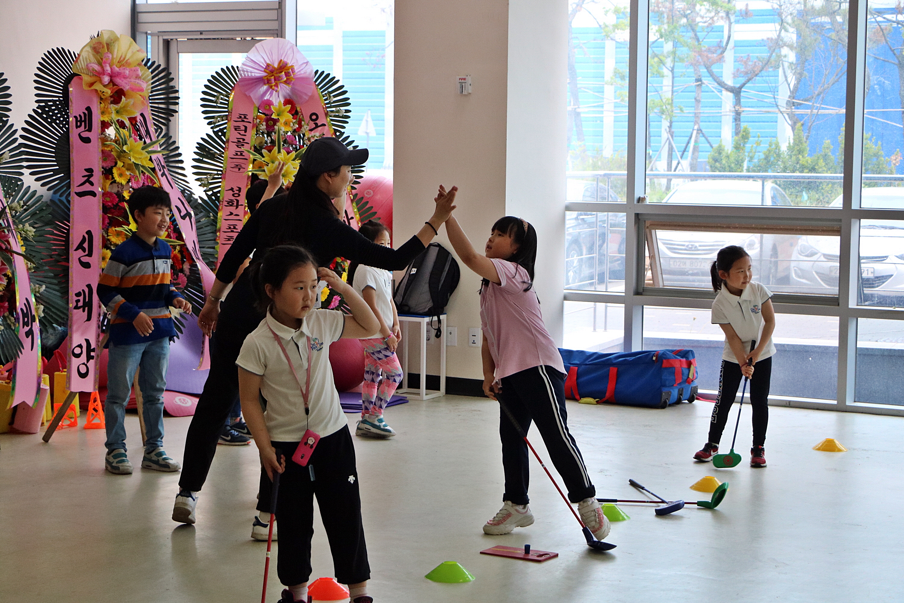 목표물에 볼을 갖다 붙이고 기뻐하며 코치님과 하이파이브를 하는 모습