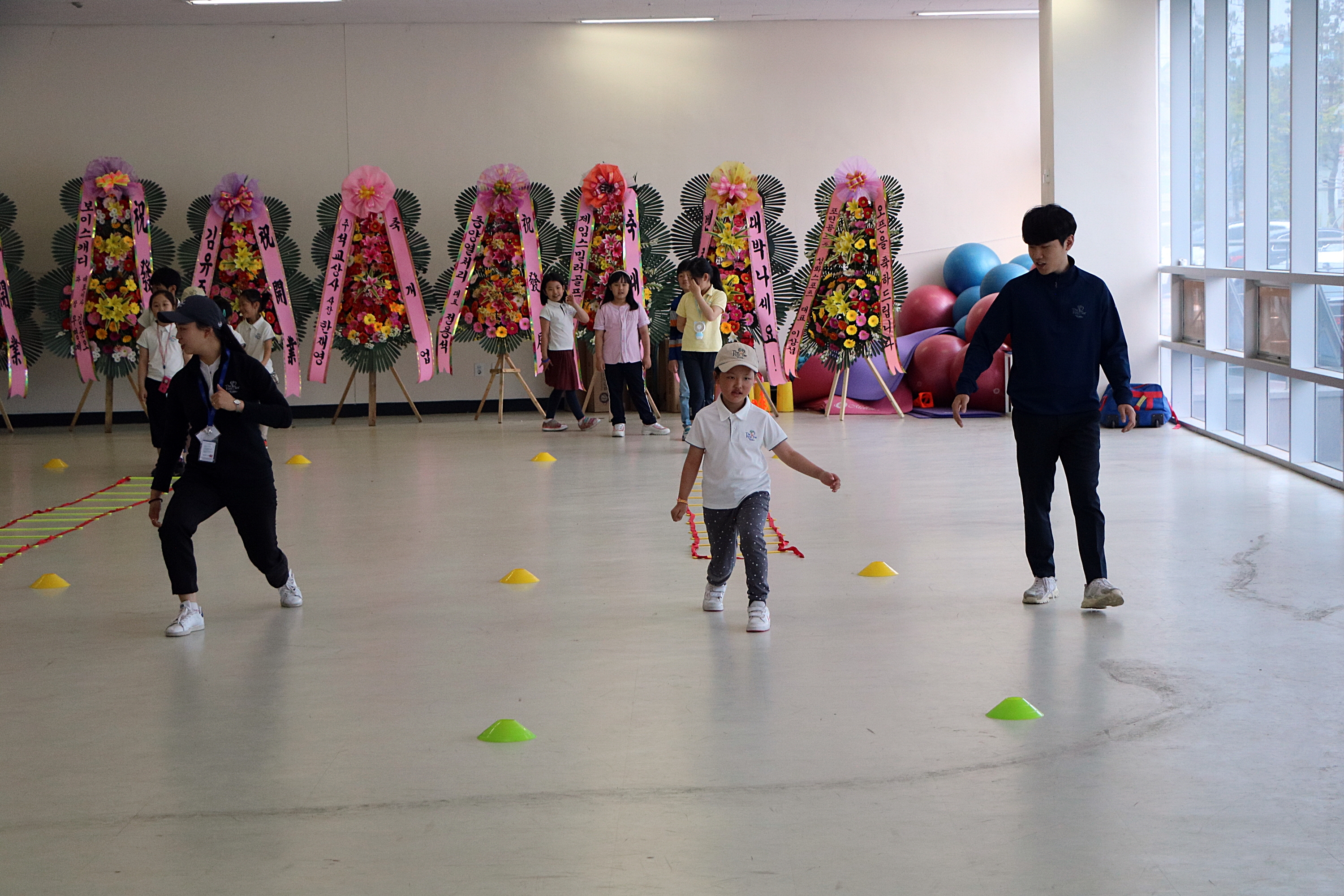 런지동작을 하며 다리 근육을 풀어주고 있는 모습