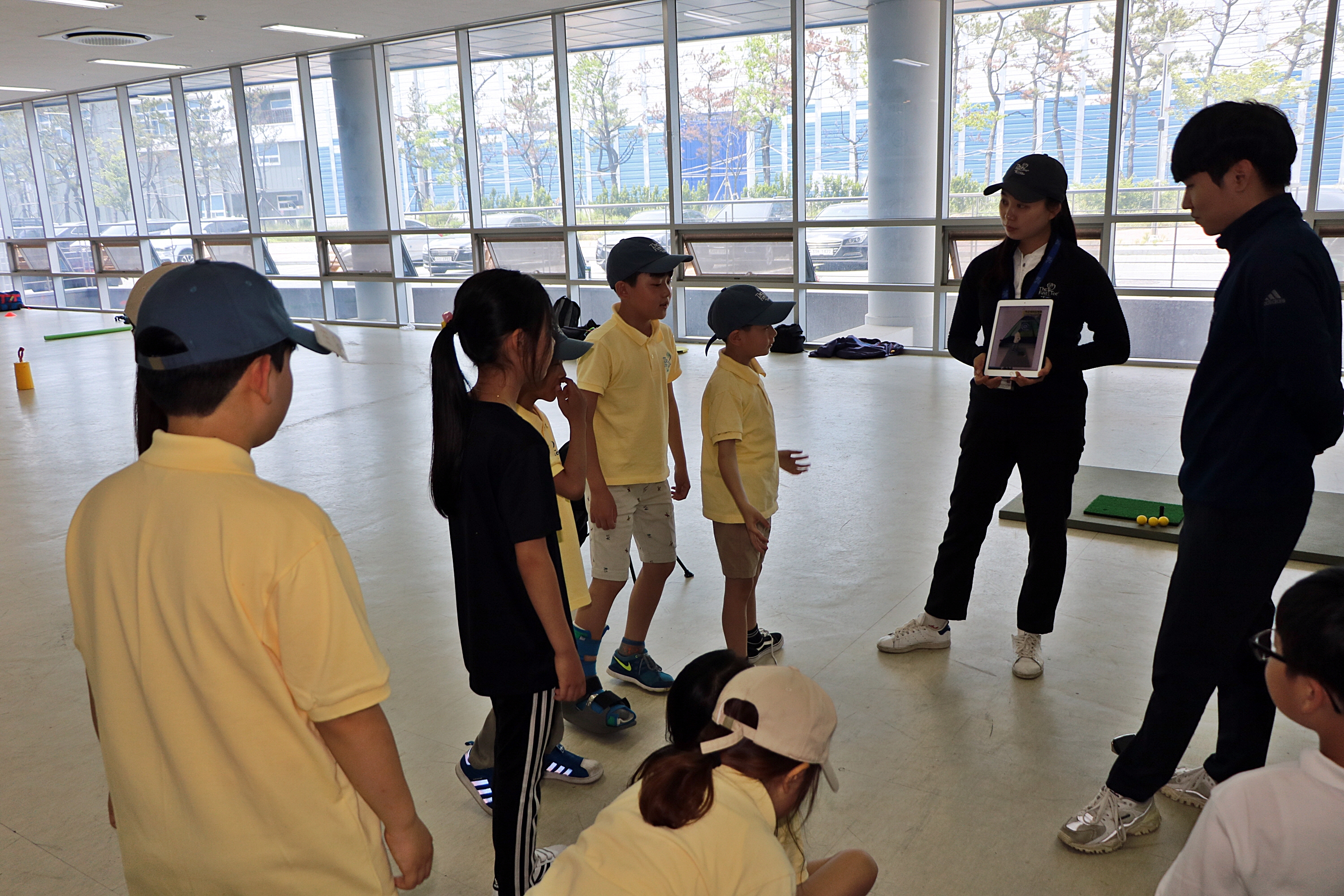 아이패드로 촬영한 개인별 스윙을 보며 서로 잘된 점과 개선점을 토론하고 있는 모습