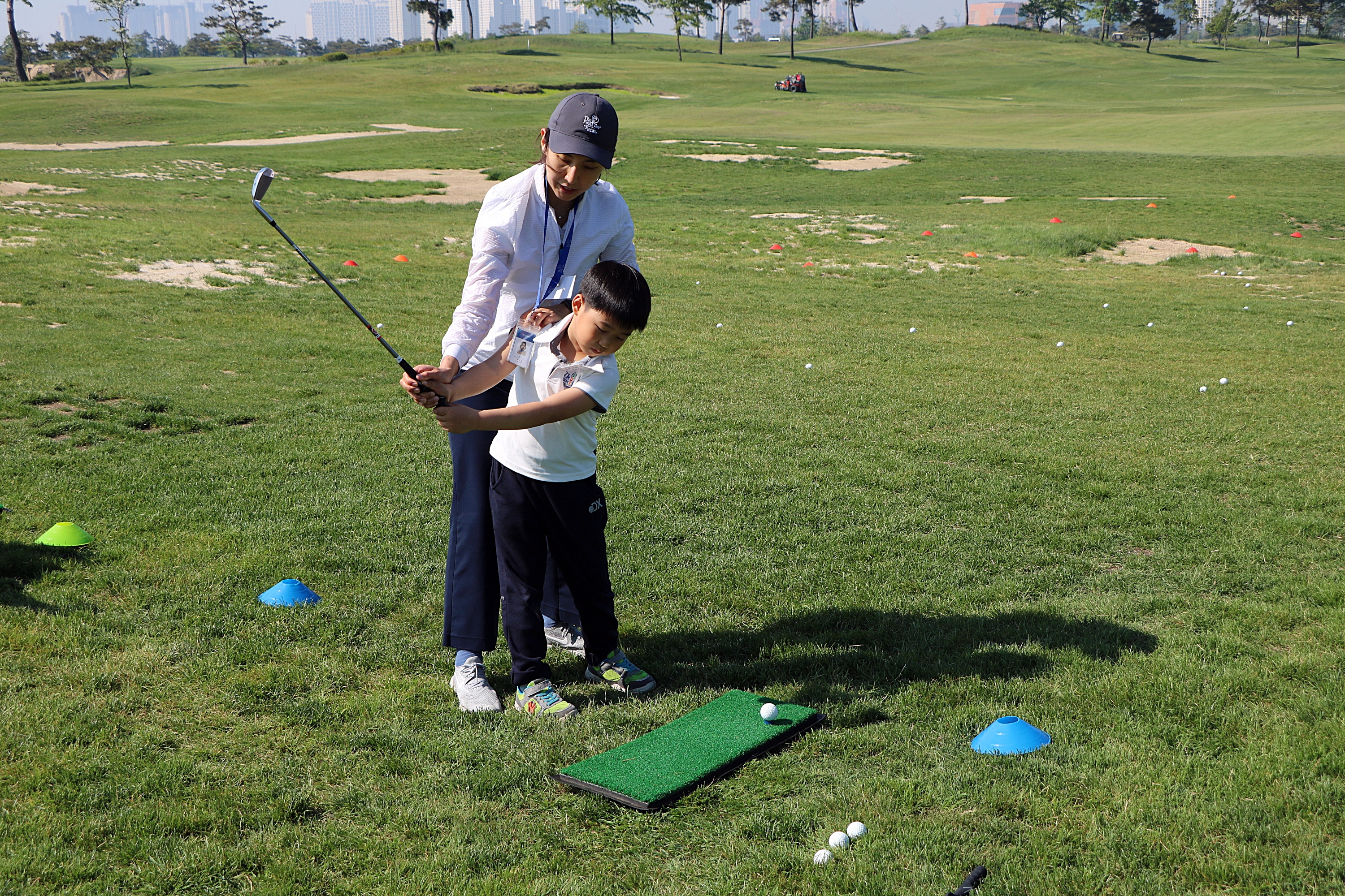 개별적으로 백스윙에 대한 요령을 자세히 가르쳐 주고 있는 모습