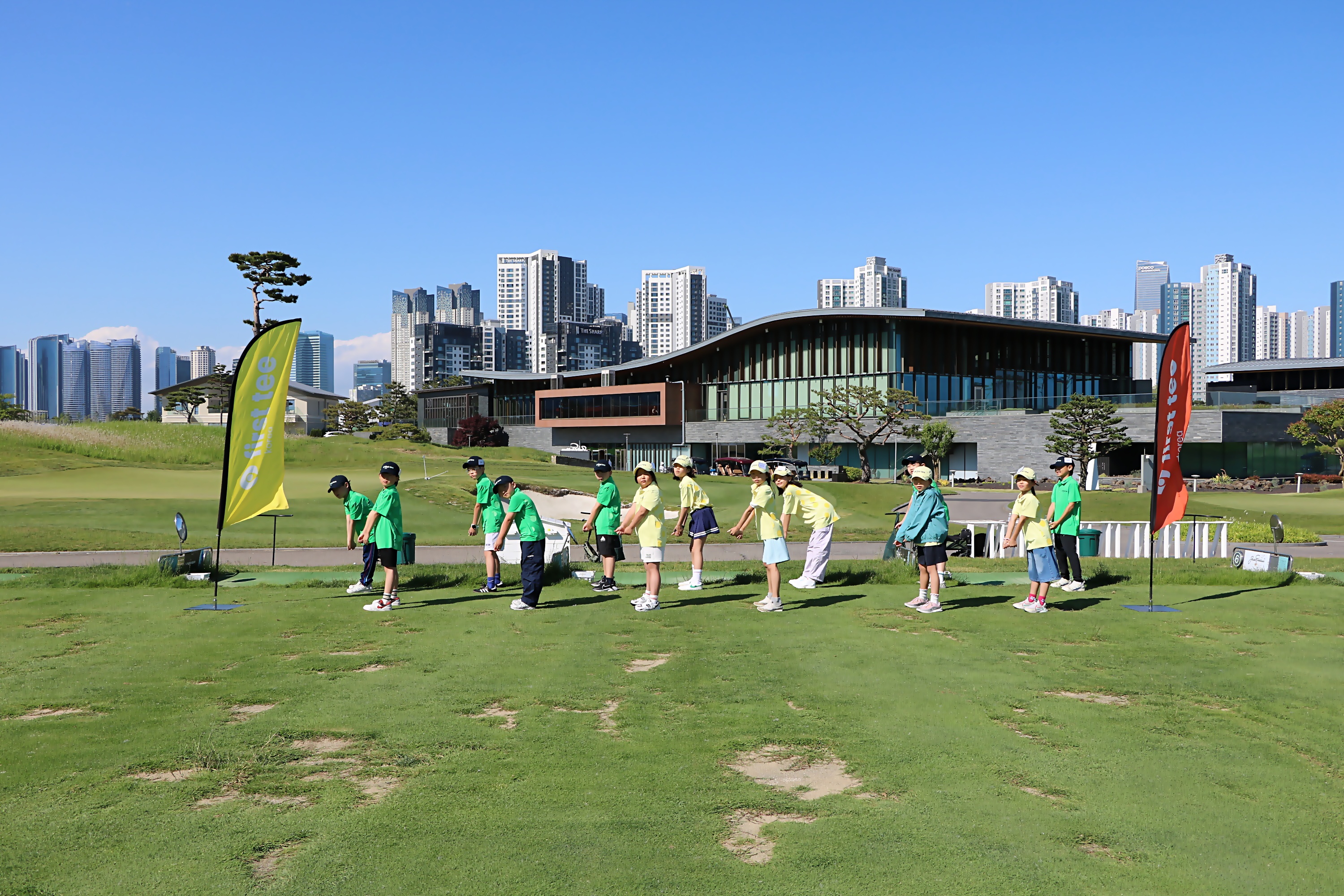 단체로 어드레스 동작과 피니쉬 동작을 취하며 잭니에서의 소중한 추억을 가슴에 새기고 있다.