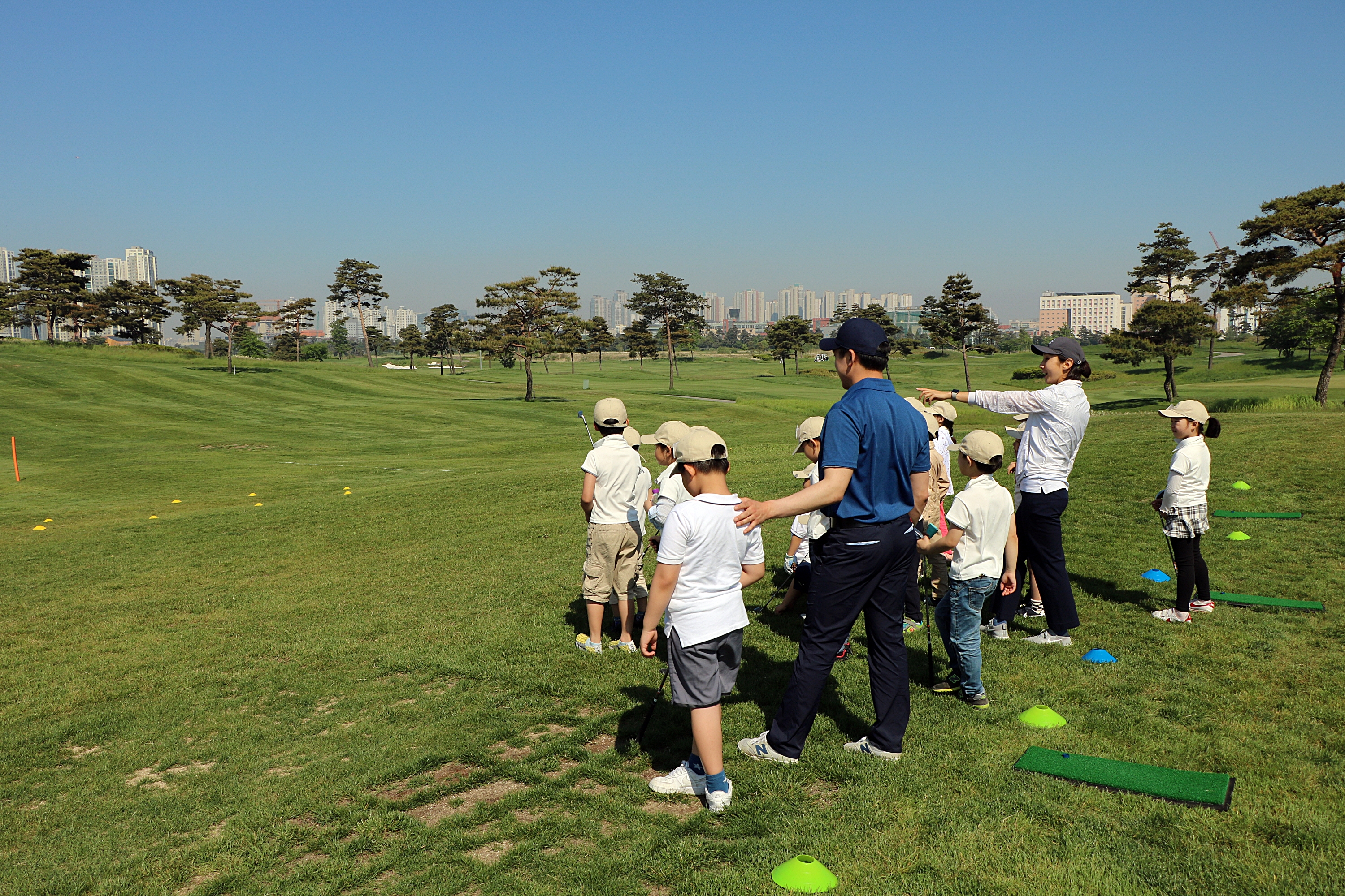 가상의 워터헤저드를 넘겨서 볼을 치는 오늘의 실습 내용에 대해서 설명 중인 모습