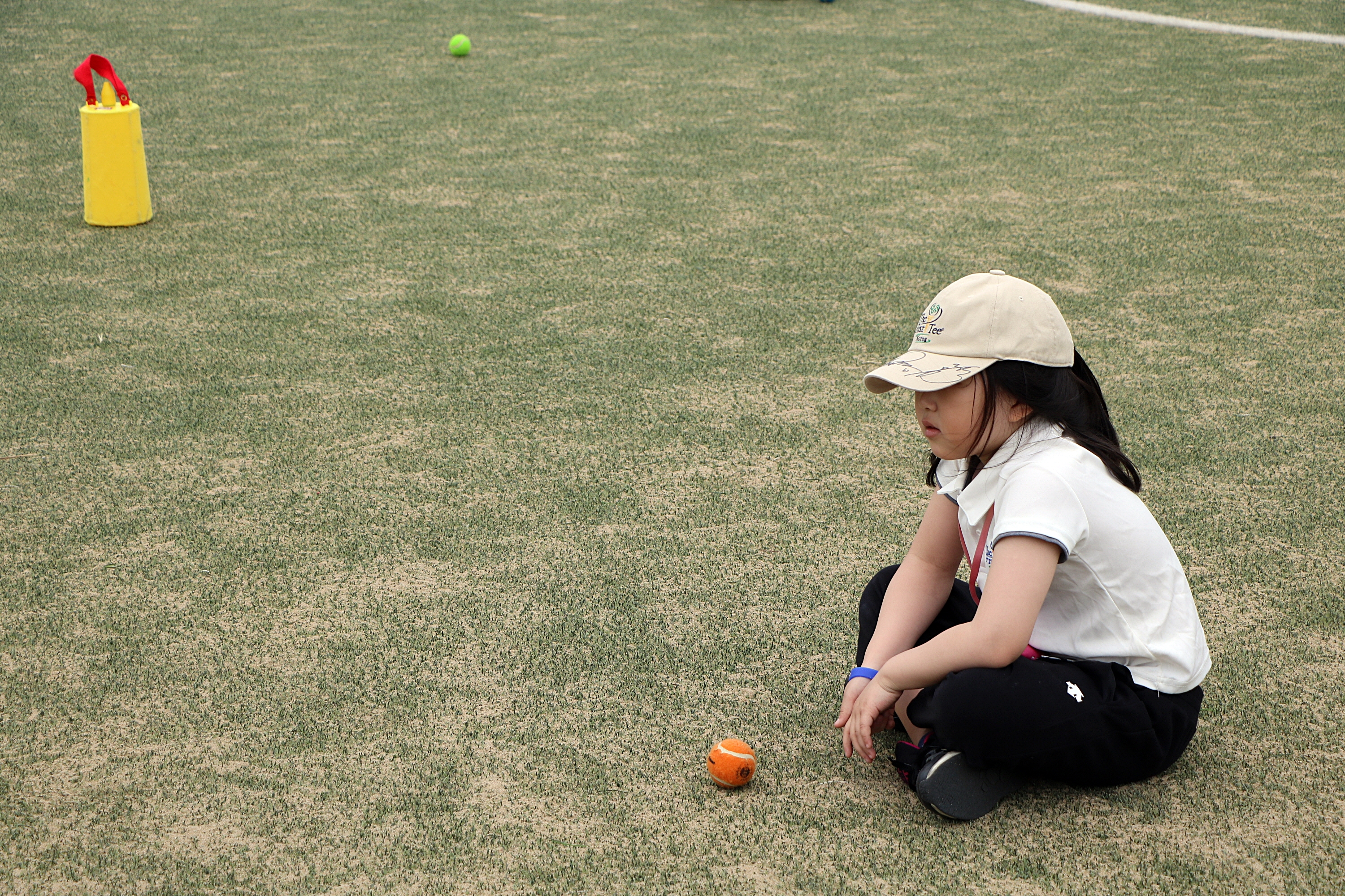 자신이 티샷한 볼 뒤에 앉아서 플레이 순서를 기다리고 있는 모습