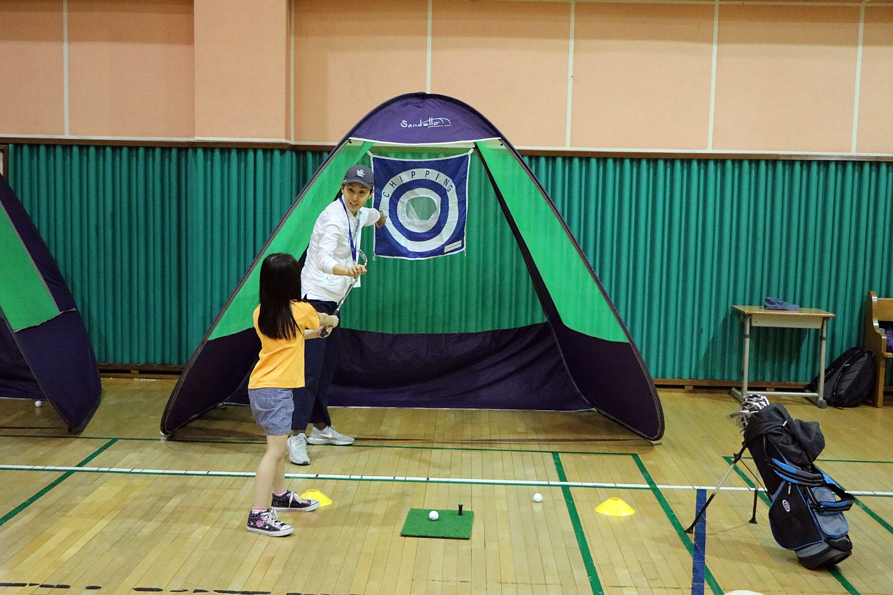 볼을 띄울 수 있도록 스윙방법을 설명해 주고 있는 모습