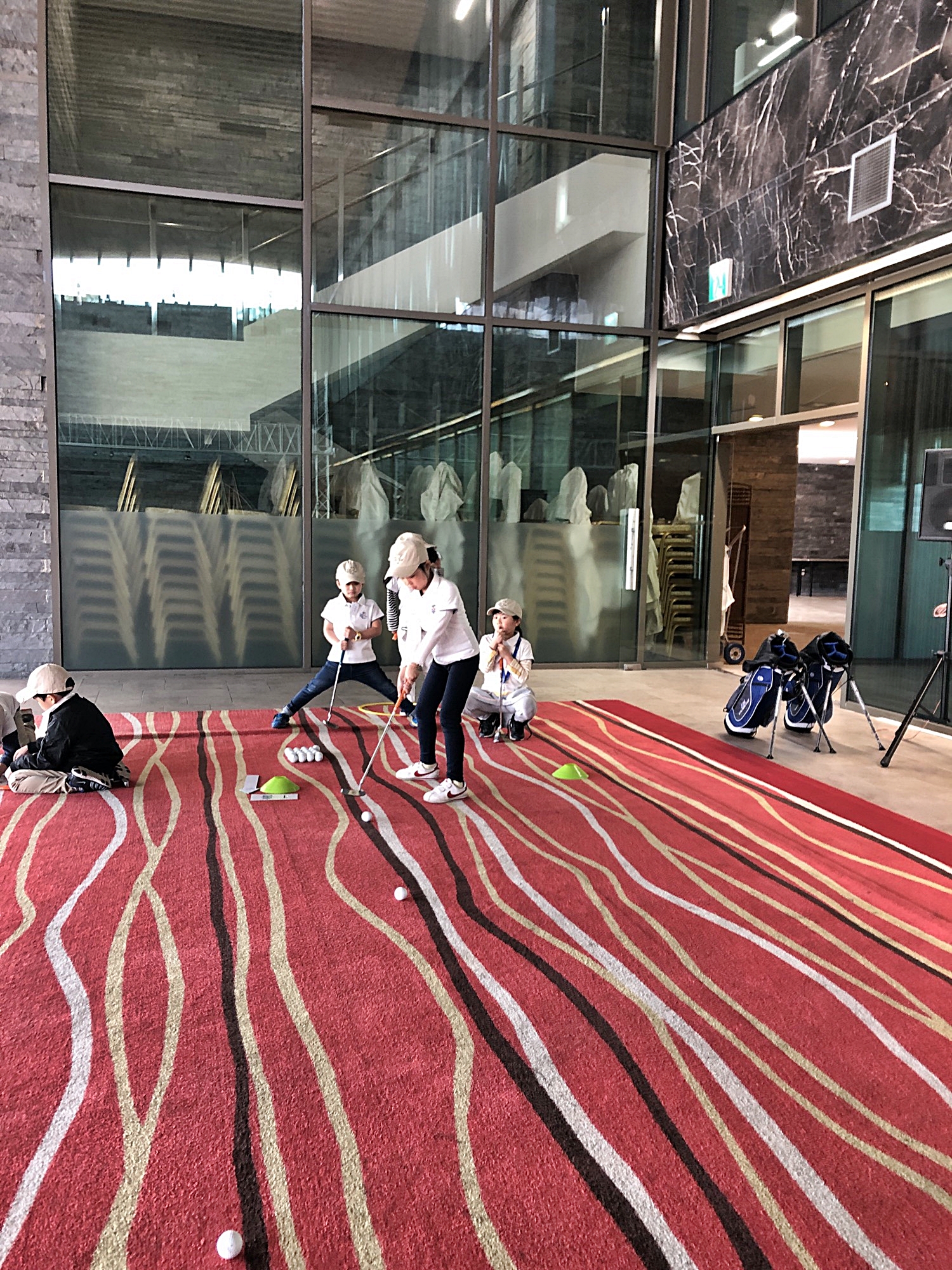 신중하게 거리감을 익히며 퍼팅 실습을 하고 있는 아이들