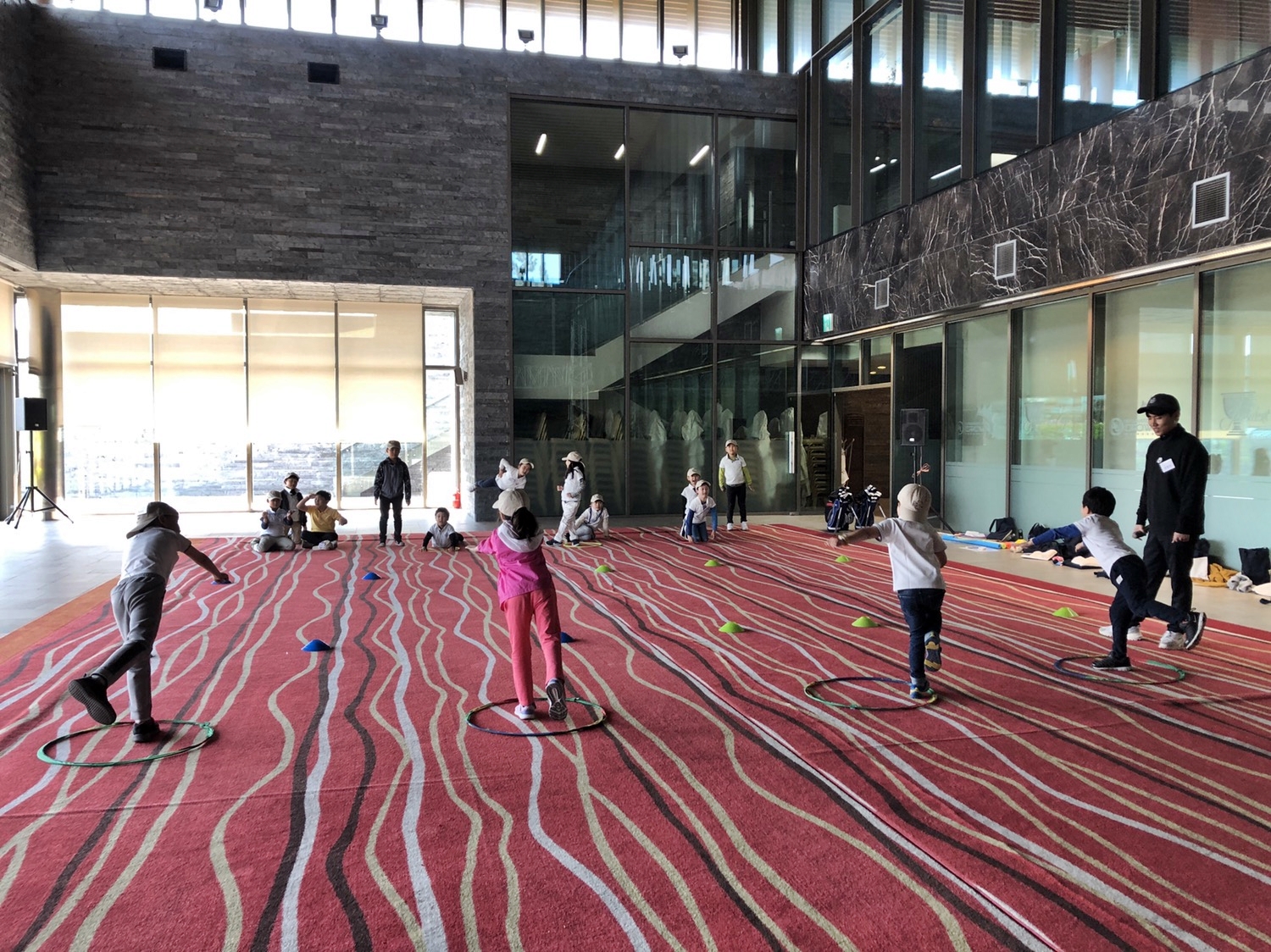 골프에서 가장 중요한 요소 중 하나인 균형 감각을 키우기 위해 몸풀기 동작을 하고 있는 아이들