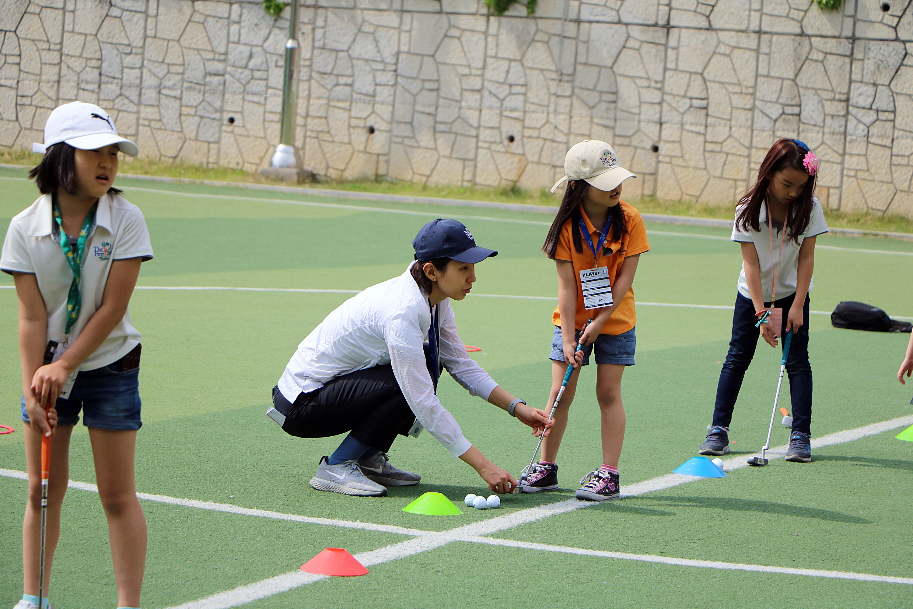 아이들이 퍼트시 거리감을 익히도록 1:1 레슨을 해주고 있는 모습