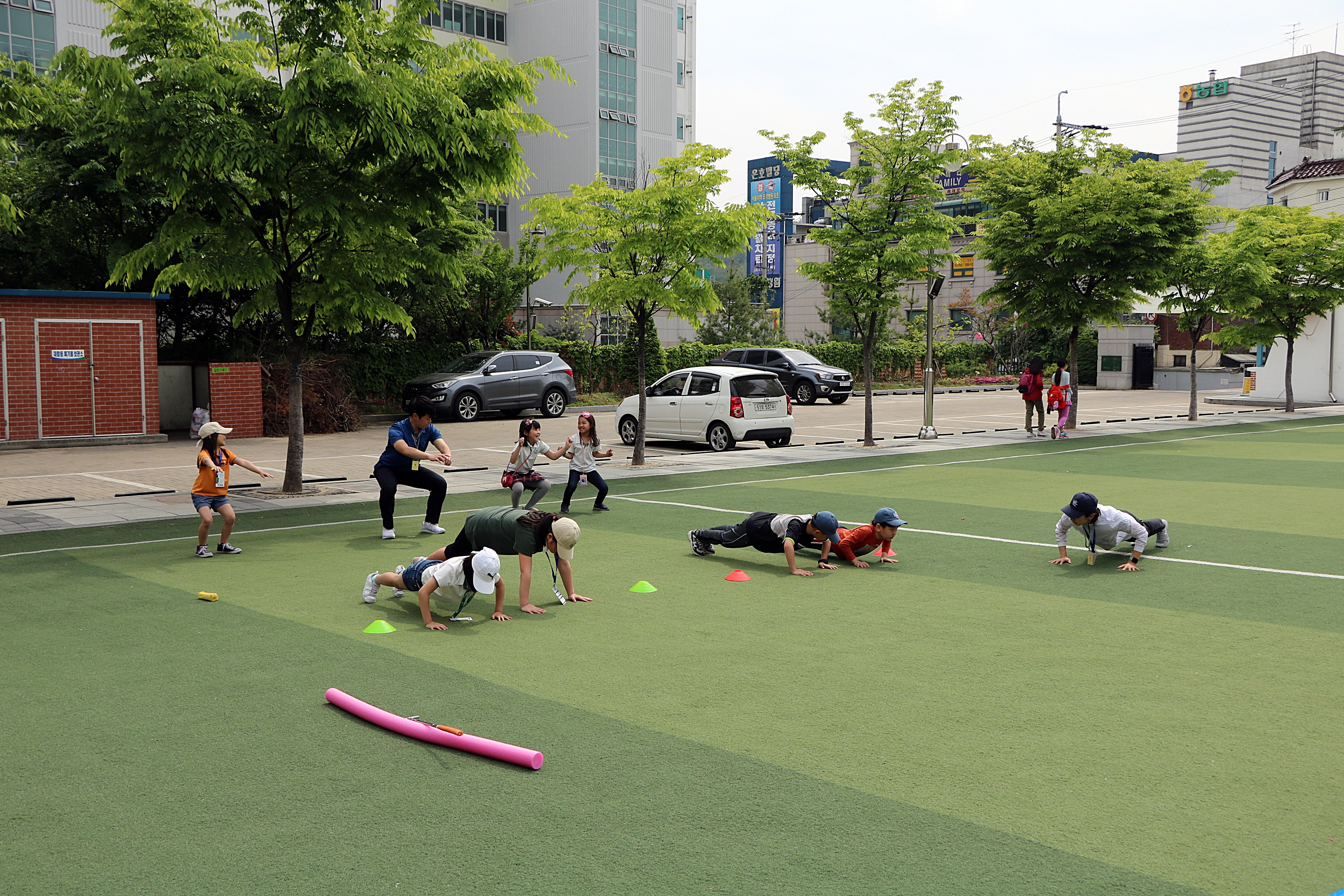 코치님과 함께 팔굽혀펴기를 하면서 근력을 강화하고 있는 아이들