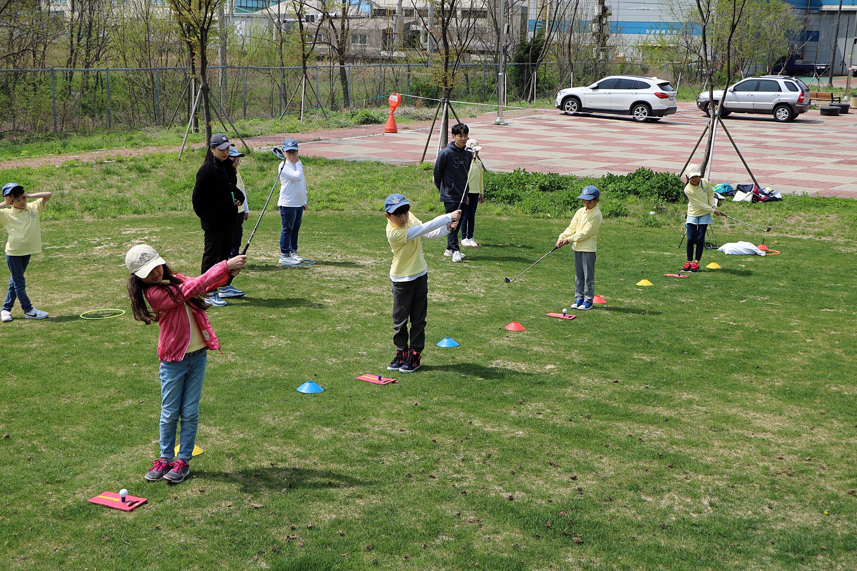 두 발을 모으고 스윙을 해야 하는 펭귄스윙자세를 취하고 있는 아이들