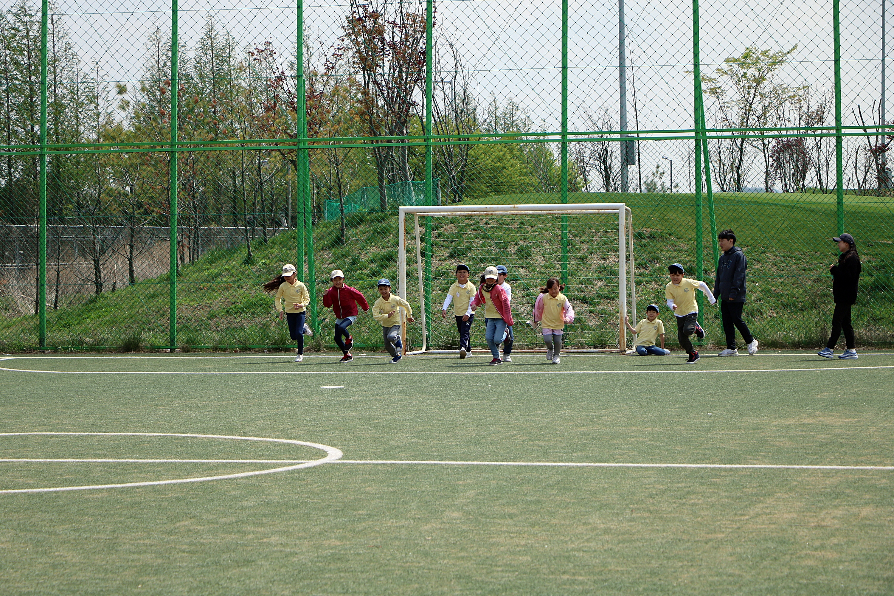 왕복달리기를 하며 기초 체력을 키우고 있는 아이들