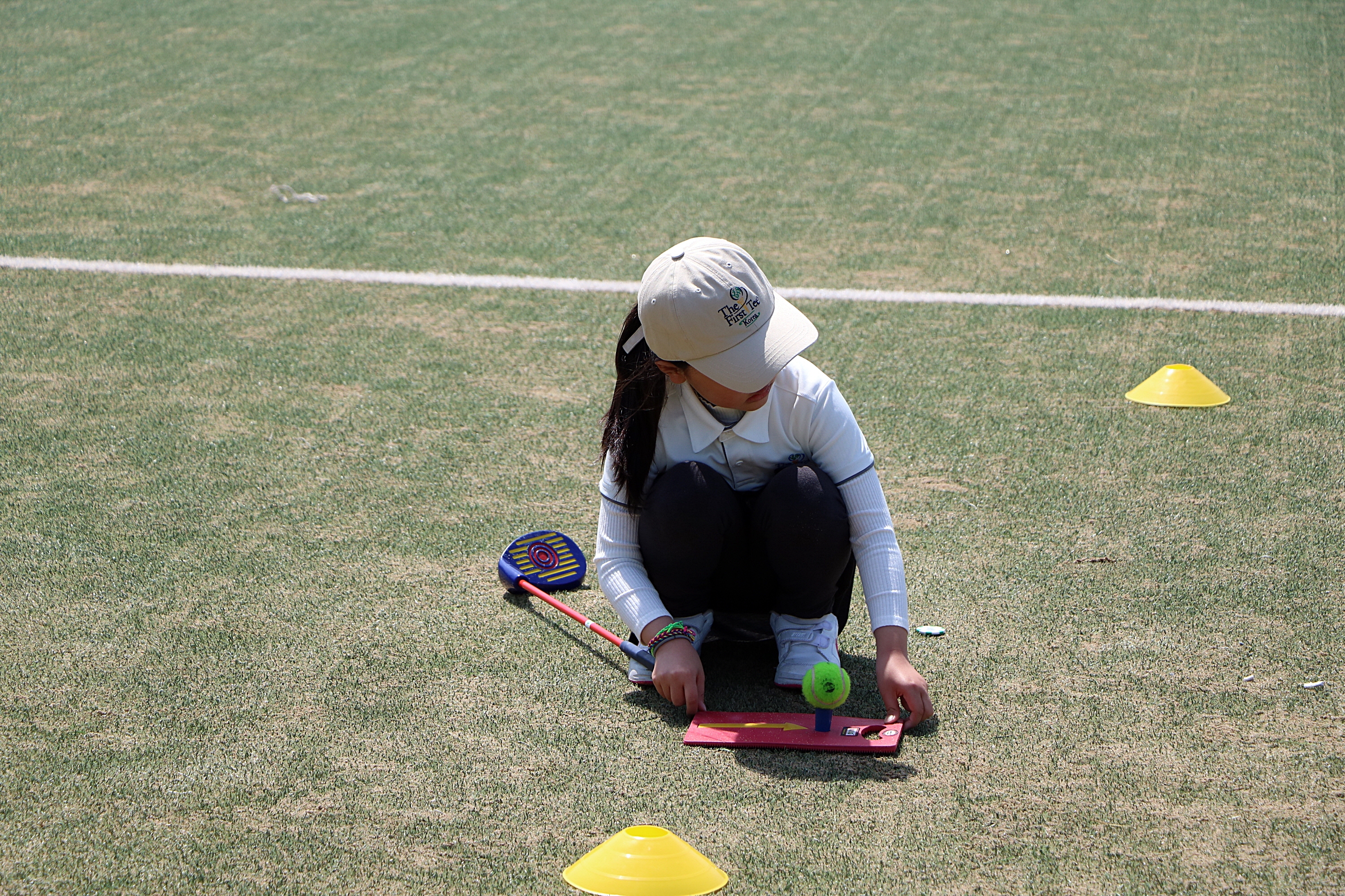 샷 하기 전 볼의 방향을 올바로 놓기 위해 런처패드의 위치를 바로잡고 있는 모습
