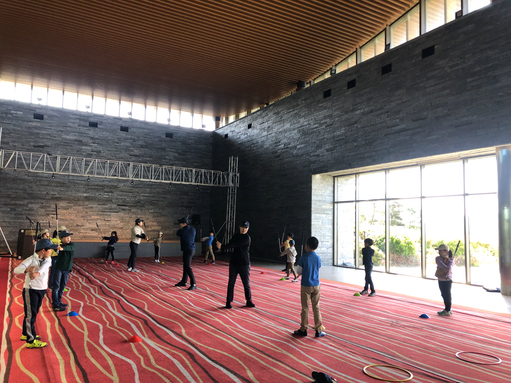 실제 골프채로 L-L 자세 실습 하는 모습
