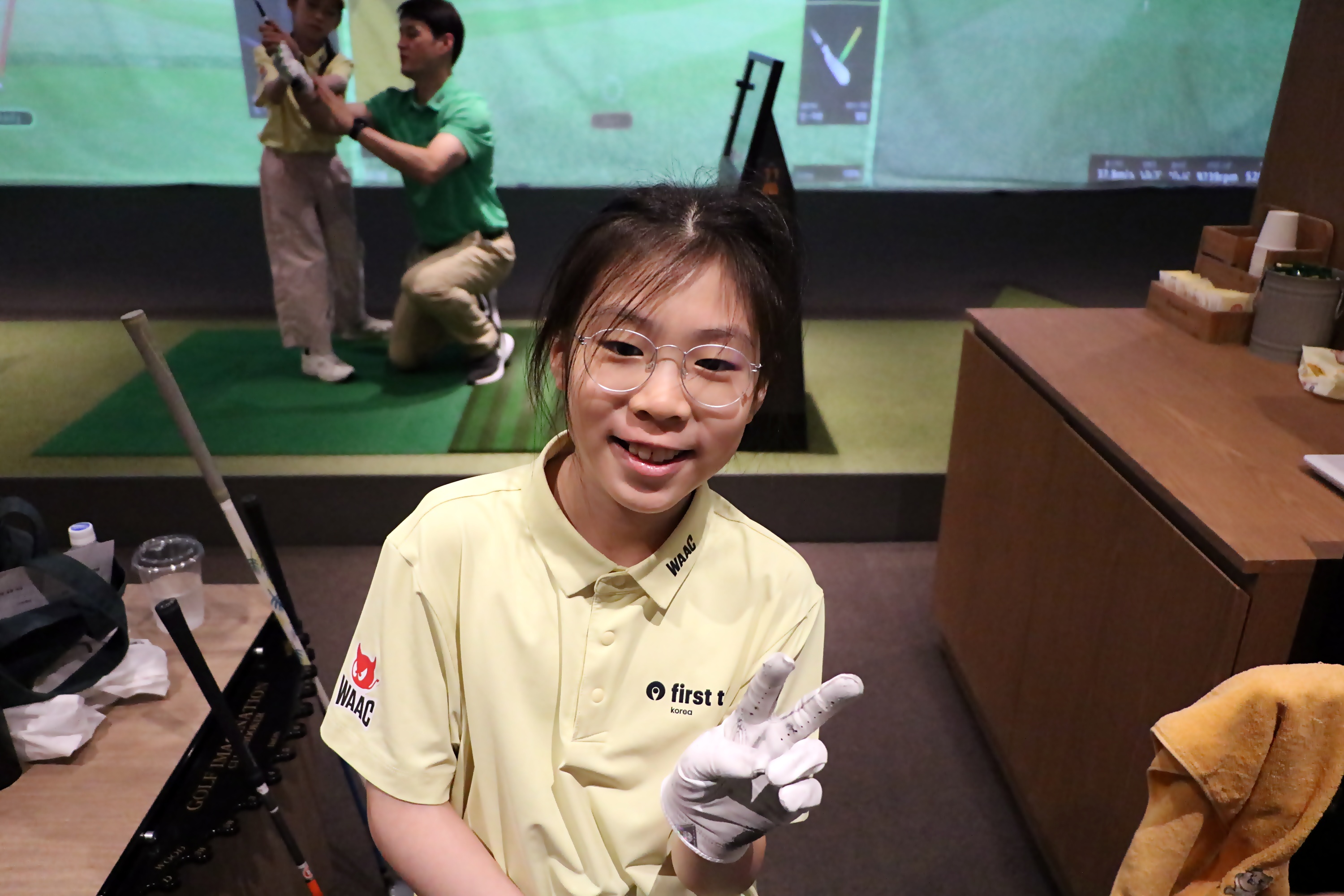 골프클럽을 세척하다가 밝게 웃으며 포즈를 취하는 교육생