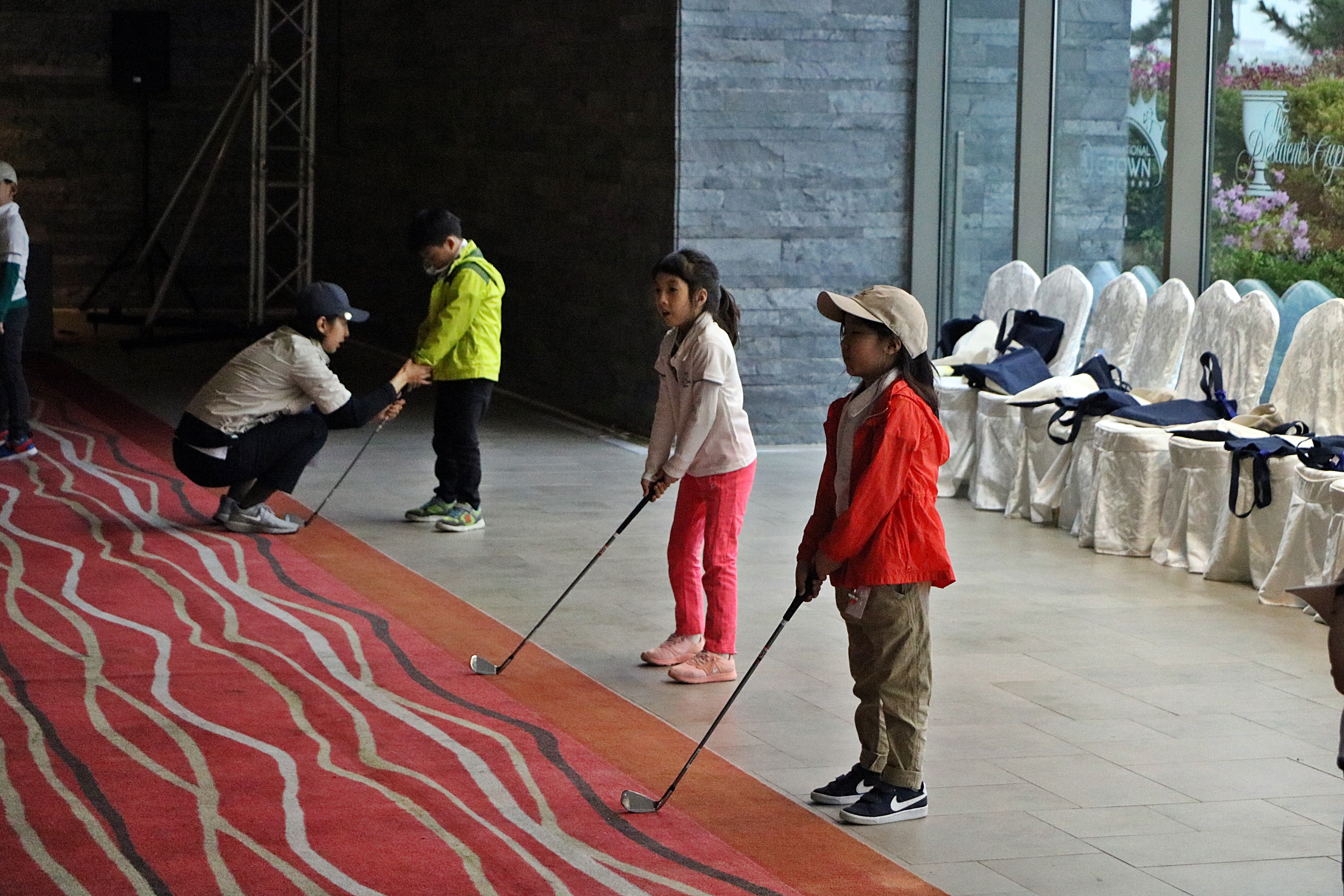 어드레스 자세를 일일이 교정해 주고 있는 모습