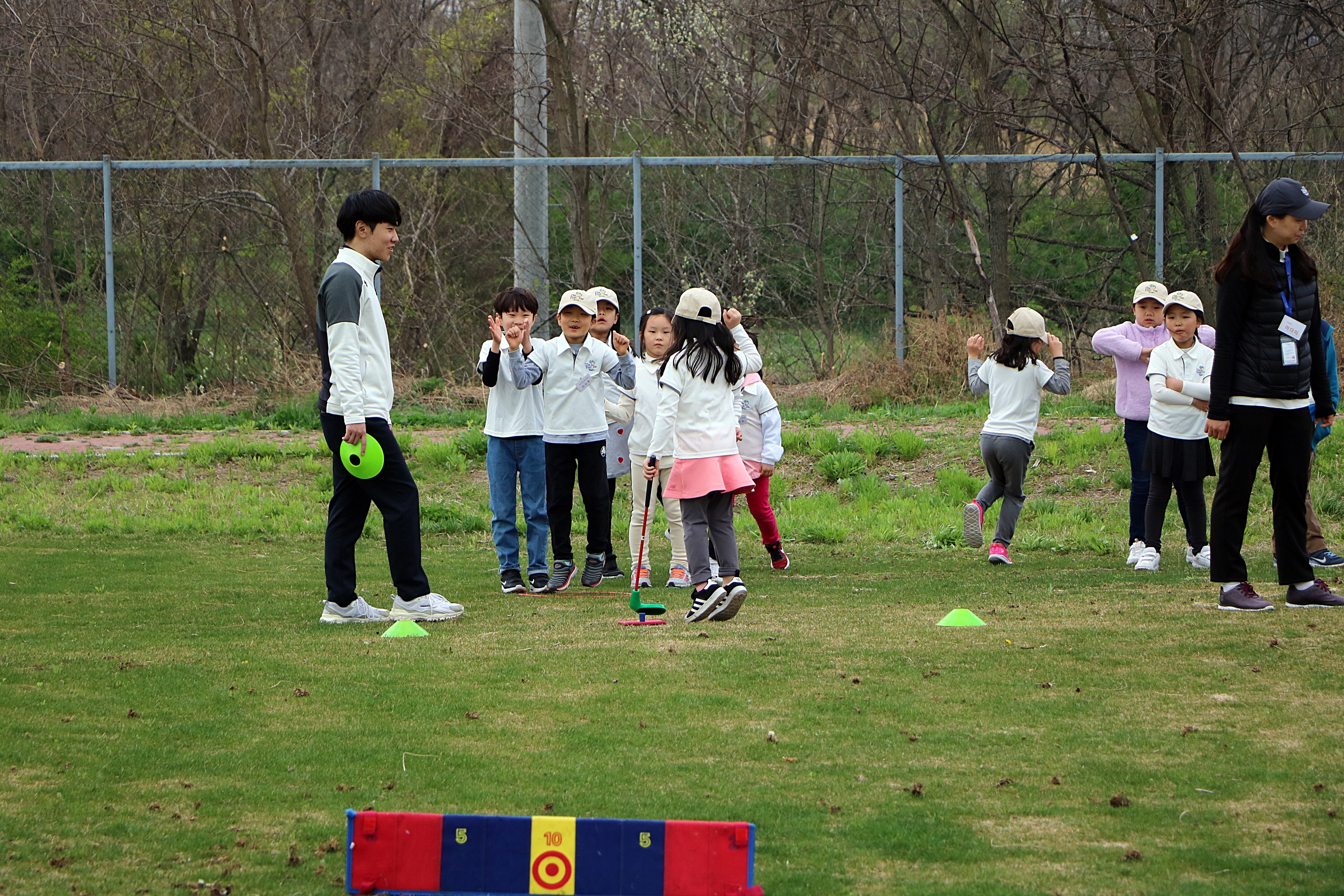 타겟에 자신이 친 공이 붙자 기뻐하는 아이와 친구들