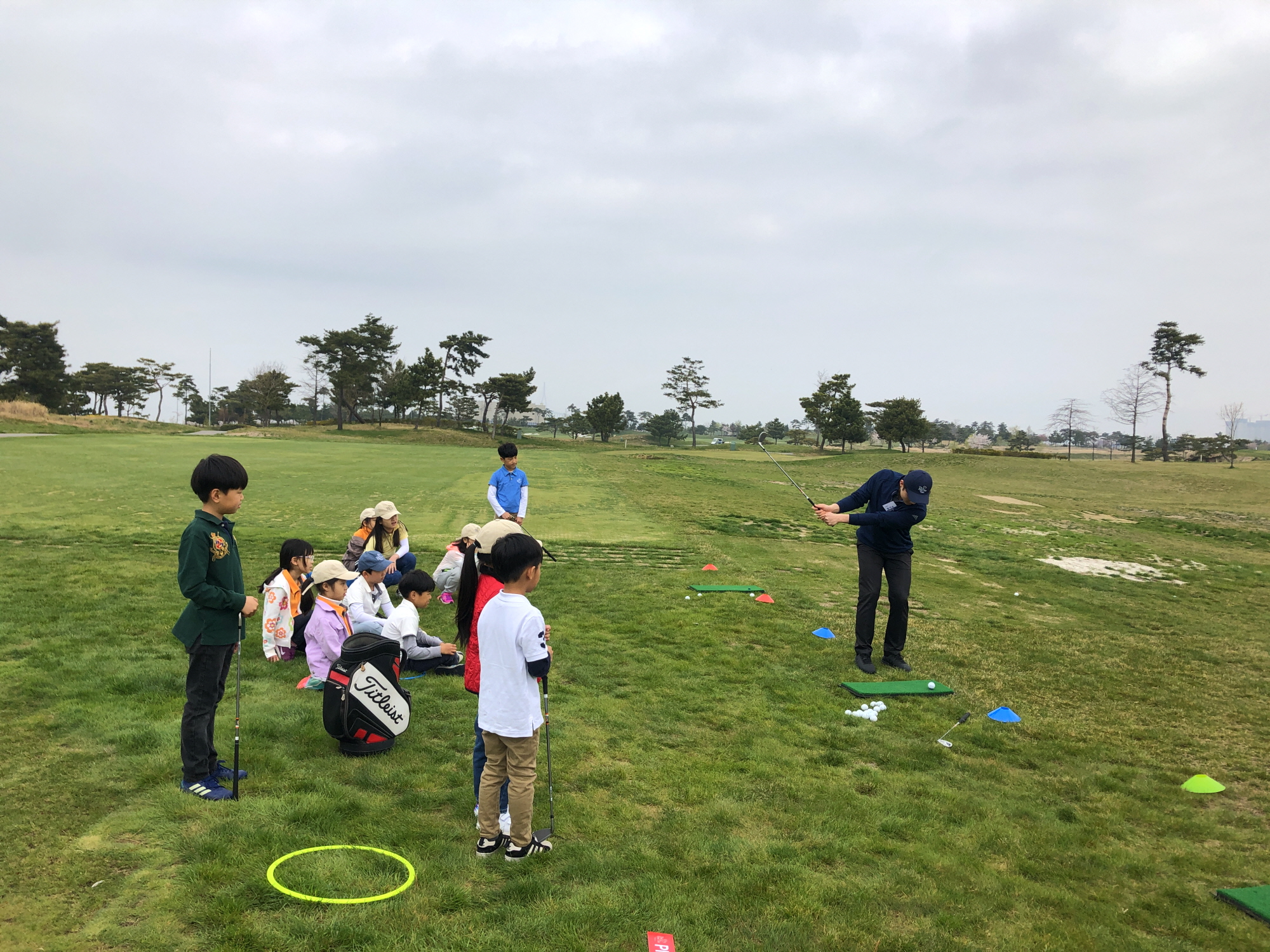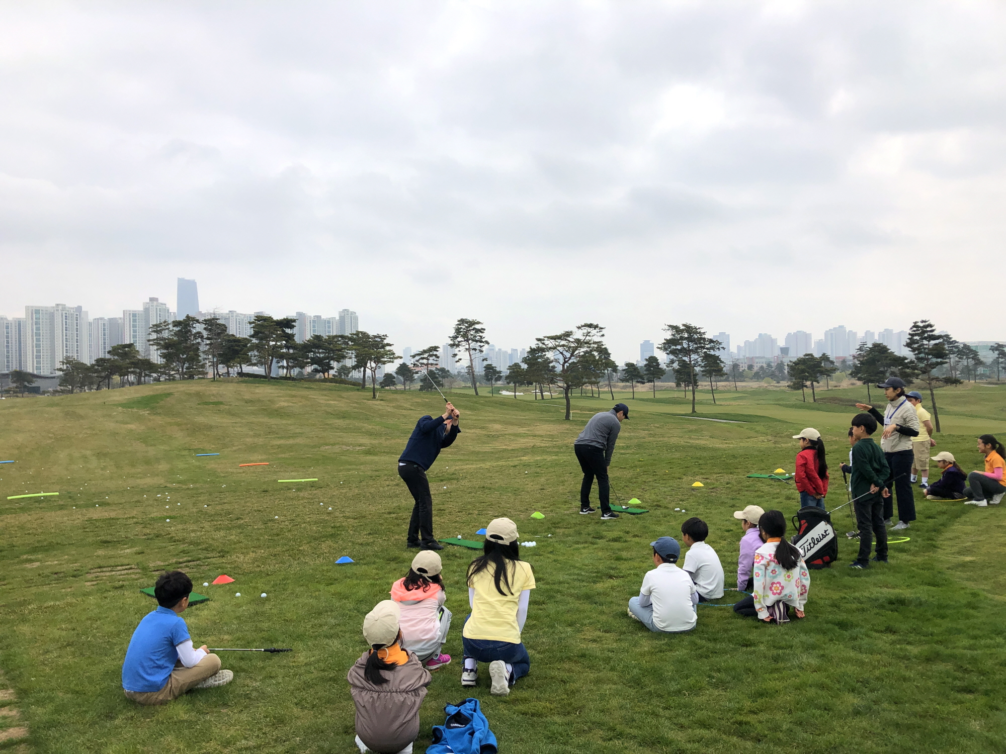 Pitch-Shot 실습 전 스윙 자세와 목표물 거리 조절에 대한 시범을 보여주고 있는 코치들
