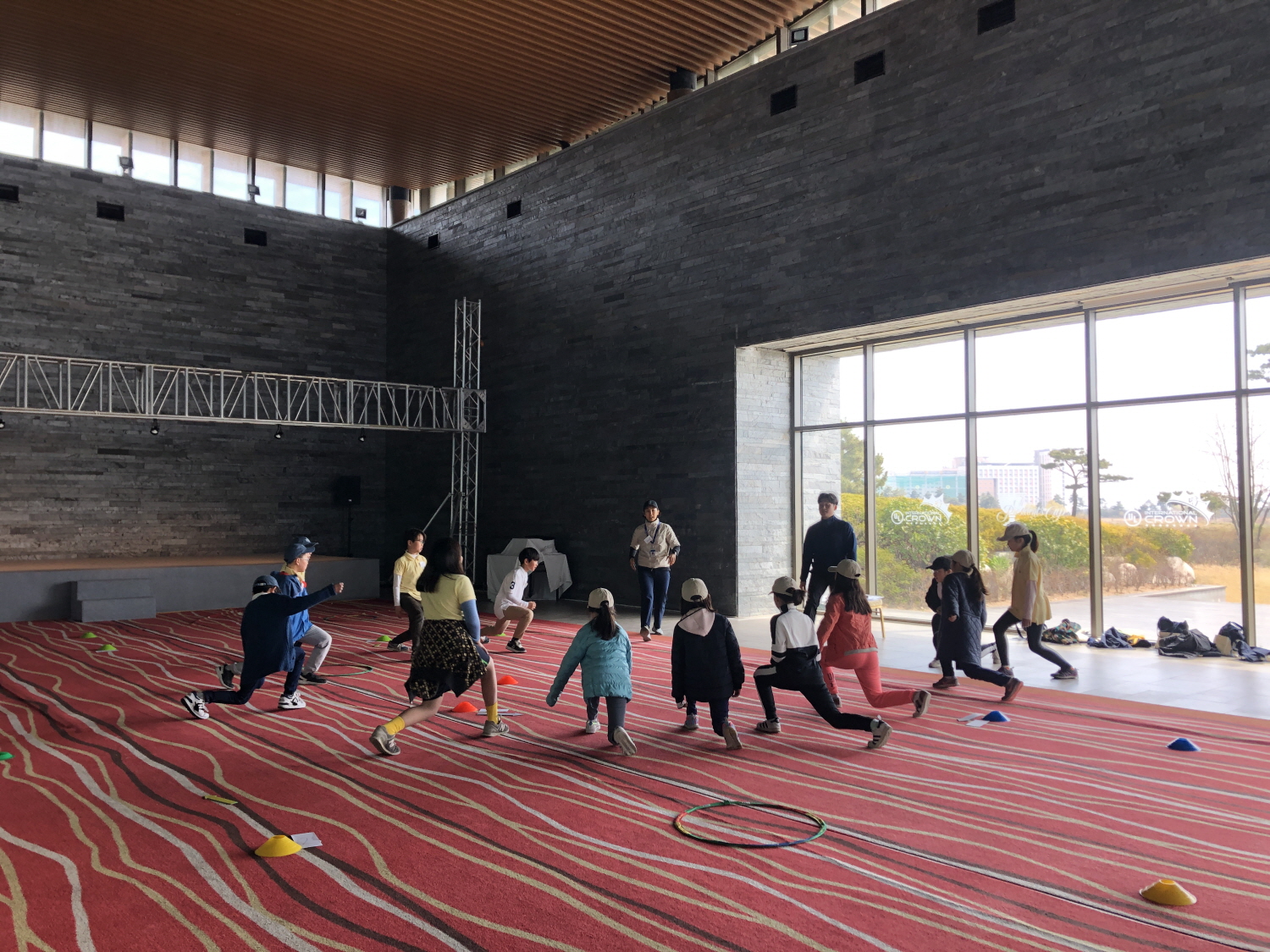준비운동 : 런치 자세를 취하며 유연성과 근력을 기르고 있는 교육생의 모습