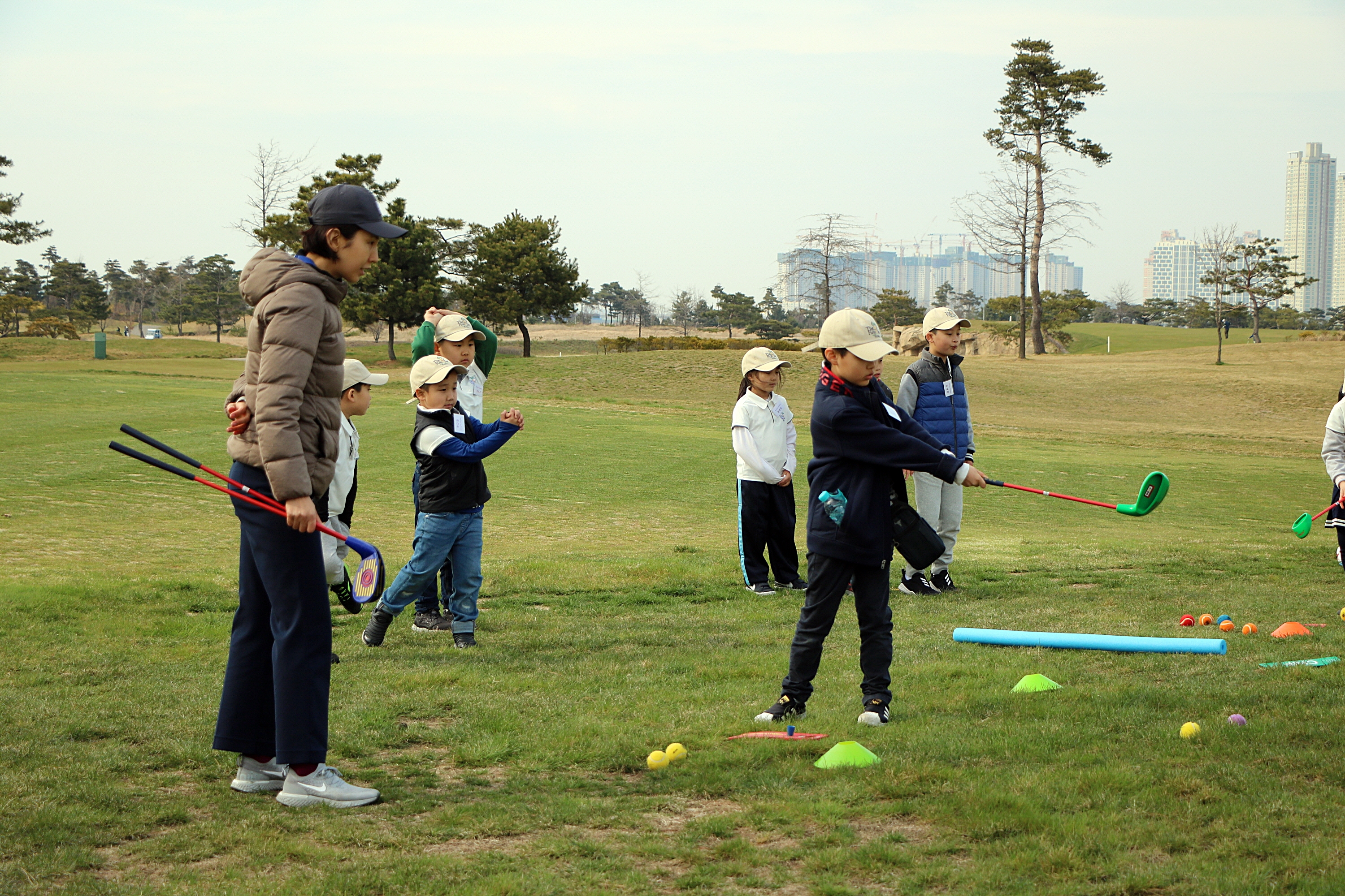 시키지 않아도 솔선수범하여 쉬면서도 스윙을 따라하고 있는 모습