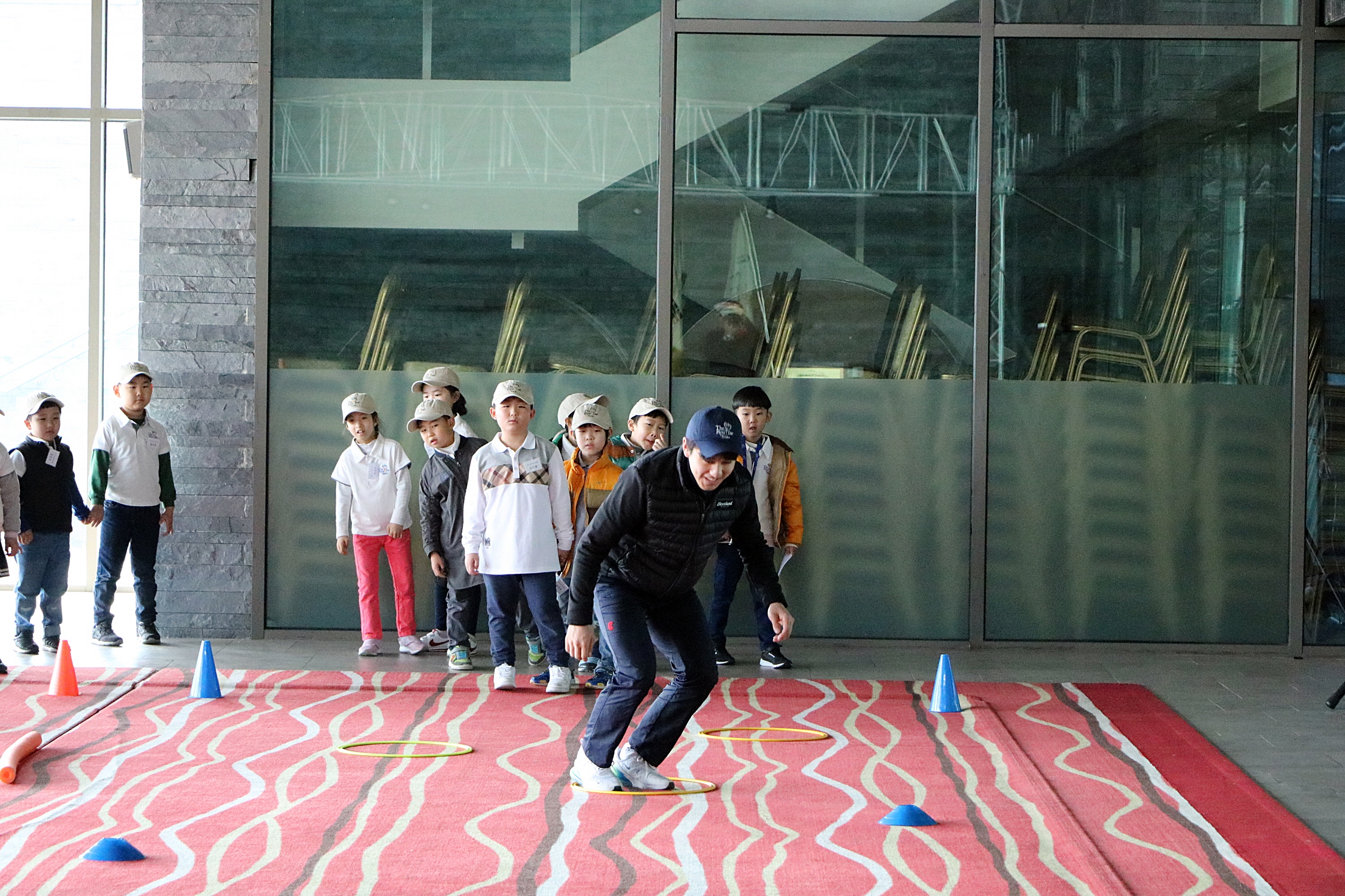 오늘 몸풀기 실습 내용 중 하나인 개구리뜀뛰기 시범을 보여주고 있는 코치