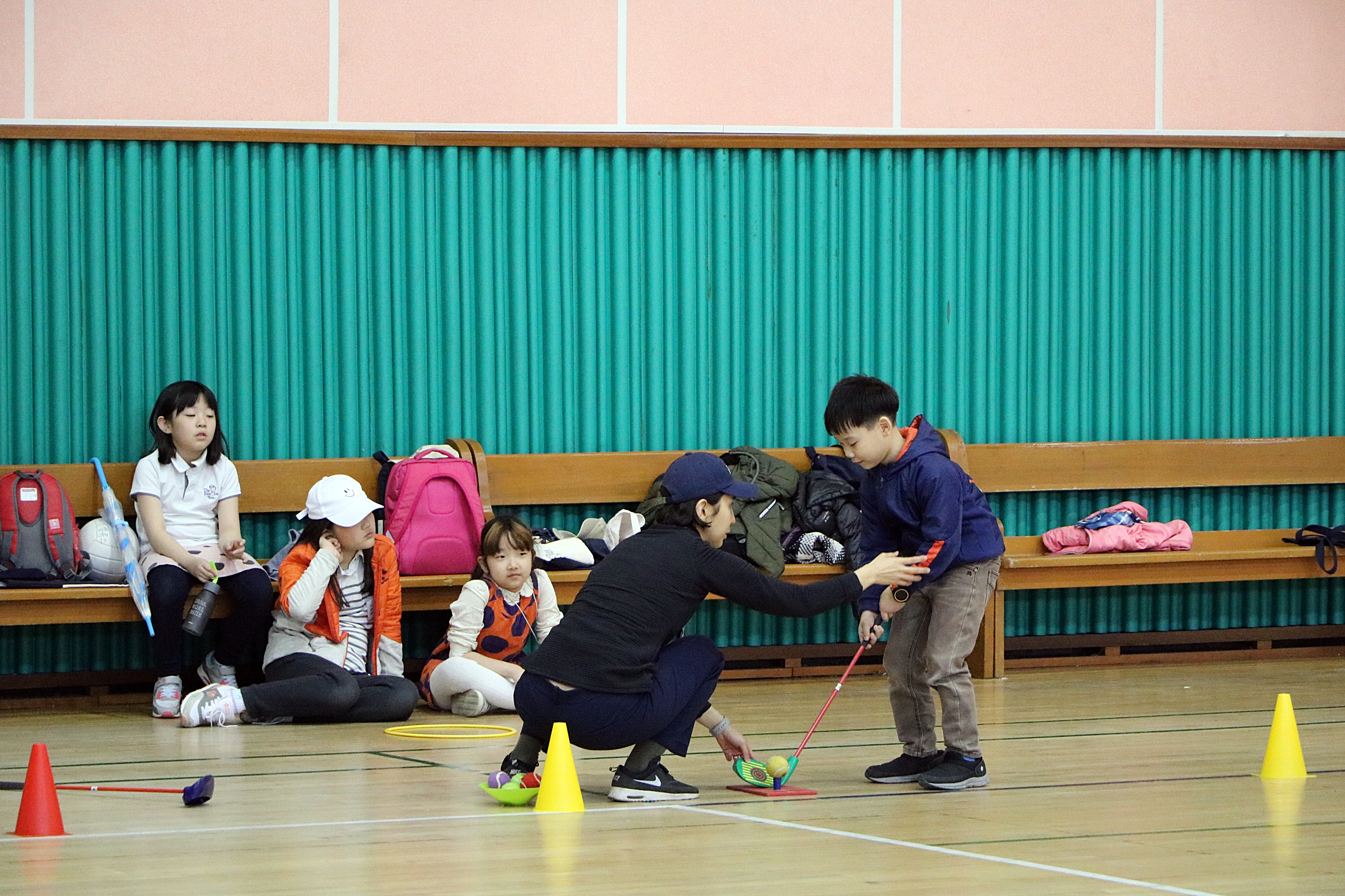 올바른 스윙동작을 할 수 있도록 1:1로 아이들에게 골프레슨을 해주고 있는 모습
