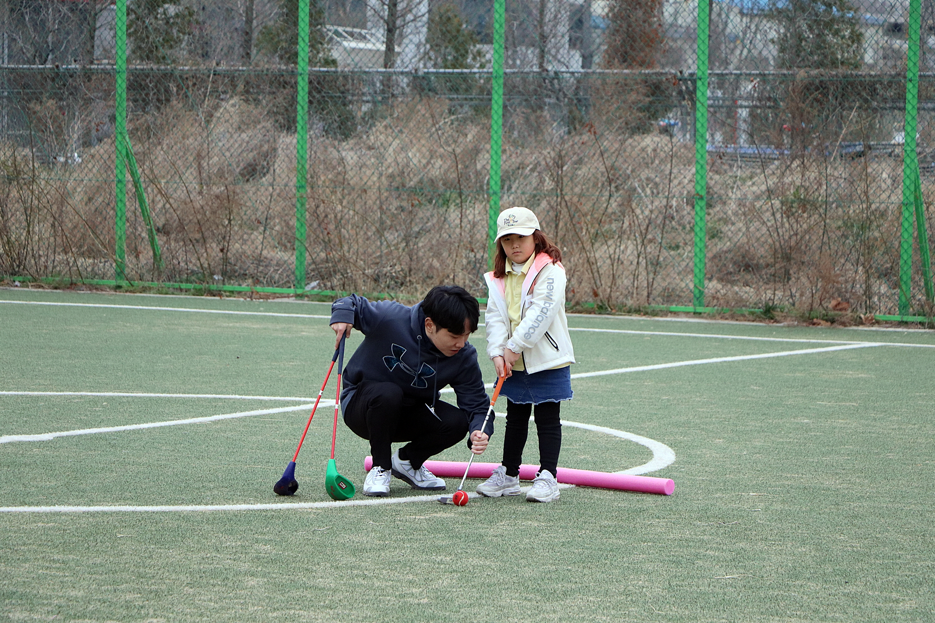 퍼트시 목표한 방향으로 볼이 굴러가게 하기 위한 방법을 친절히 가르쳐 주고 있는 모습