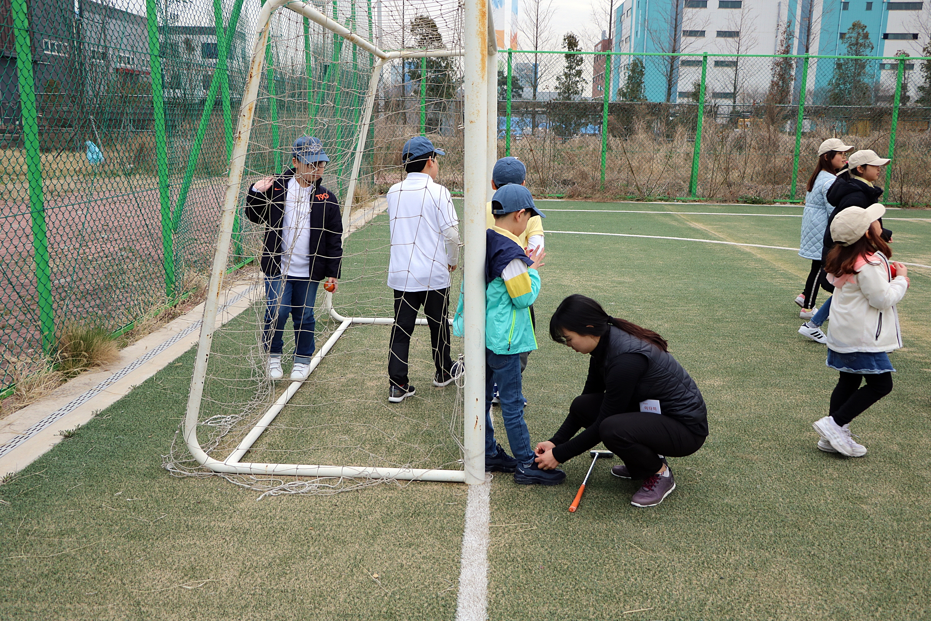 신발끈이 풀린 교육생이 넘어지지 않도록 자상하게 끈을 묶어주는 코치님