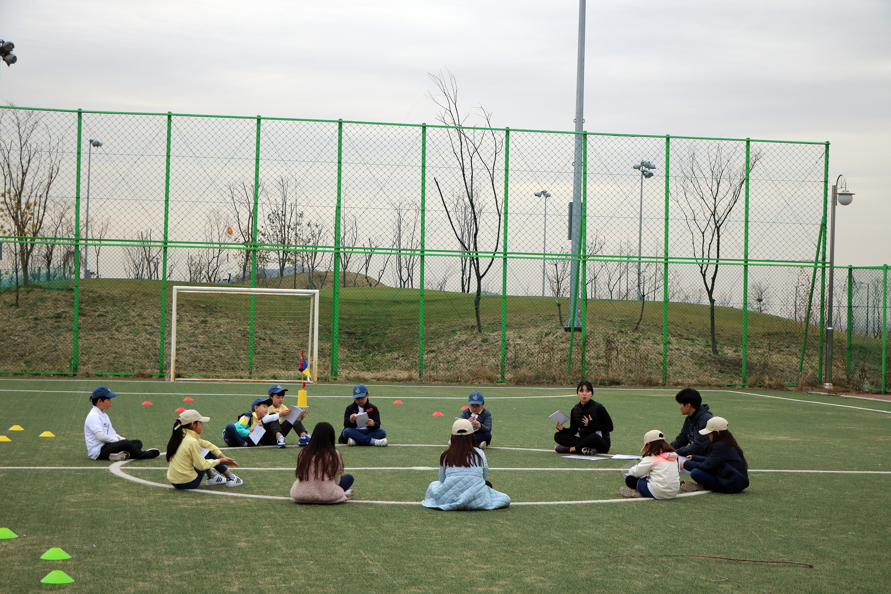 자유롭게 둘러앉아 코치님과 함께 새로운 교재를 펼쳐보며 이론 교육 중인 아이들
