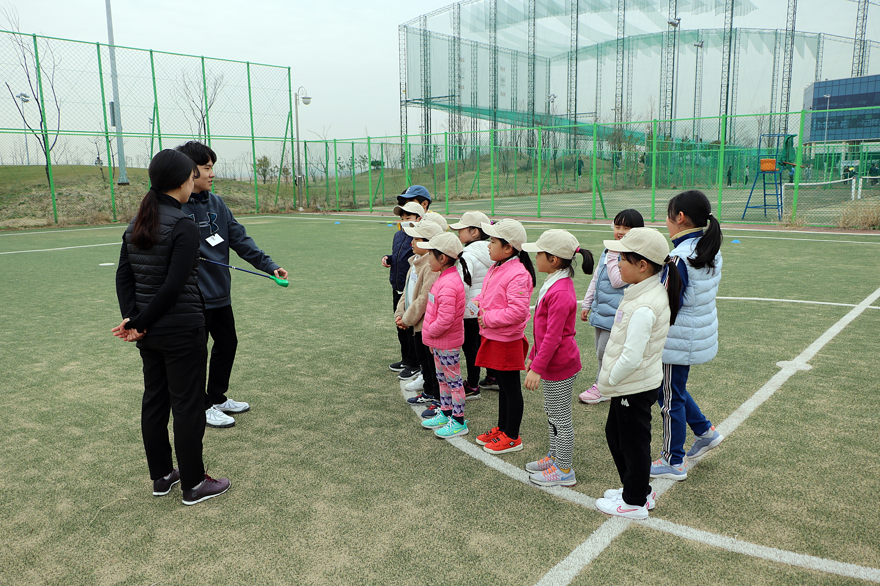 아이들에게 퍼트에 대한 사용법과 부분 명칭을 설명해주고 있는 모습