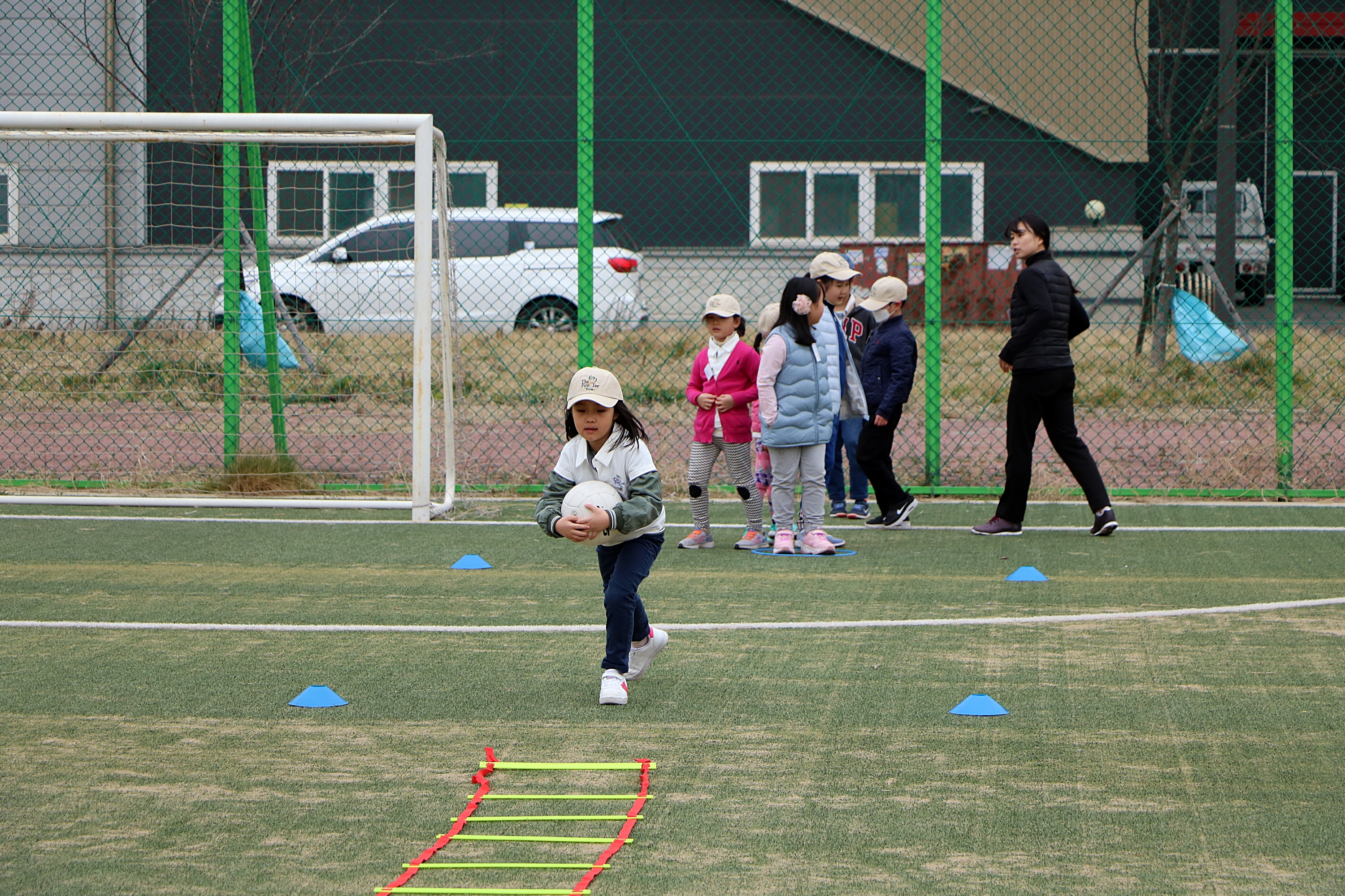 가슴에 공을 안고 런지동작을 취하고 있는 교육생