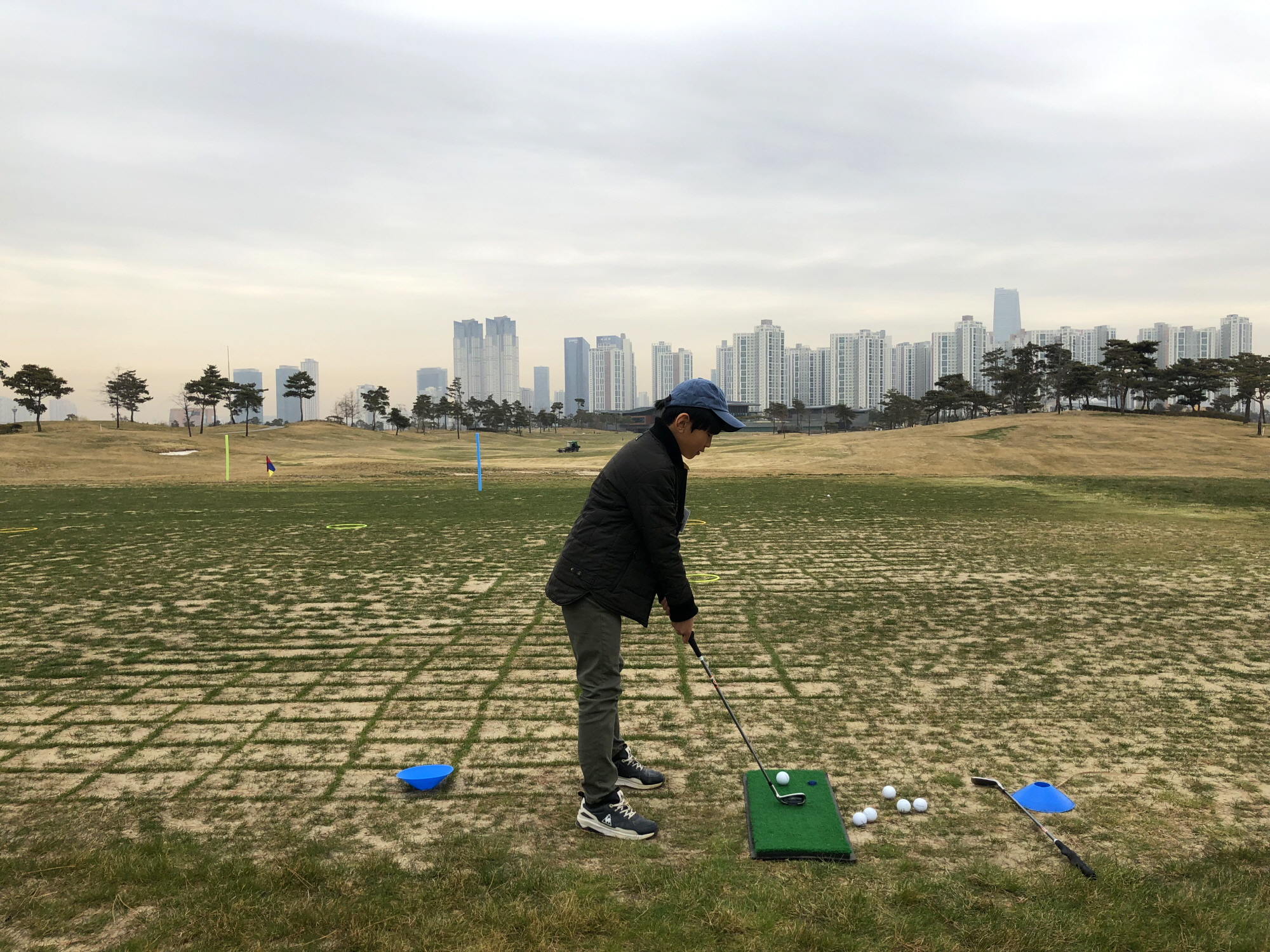 실제 골프채와 골프공으로 스윙 준비를 하는 교육생