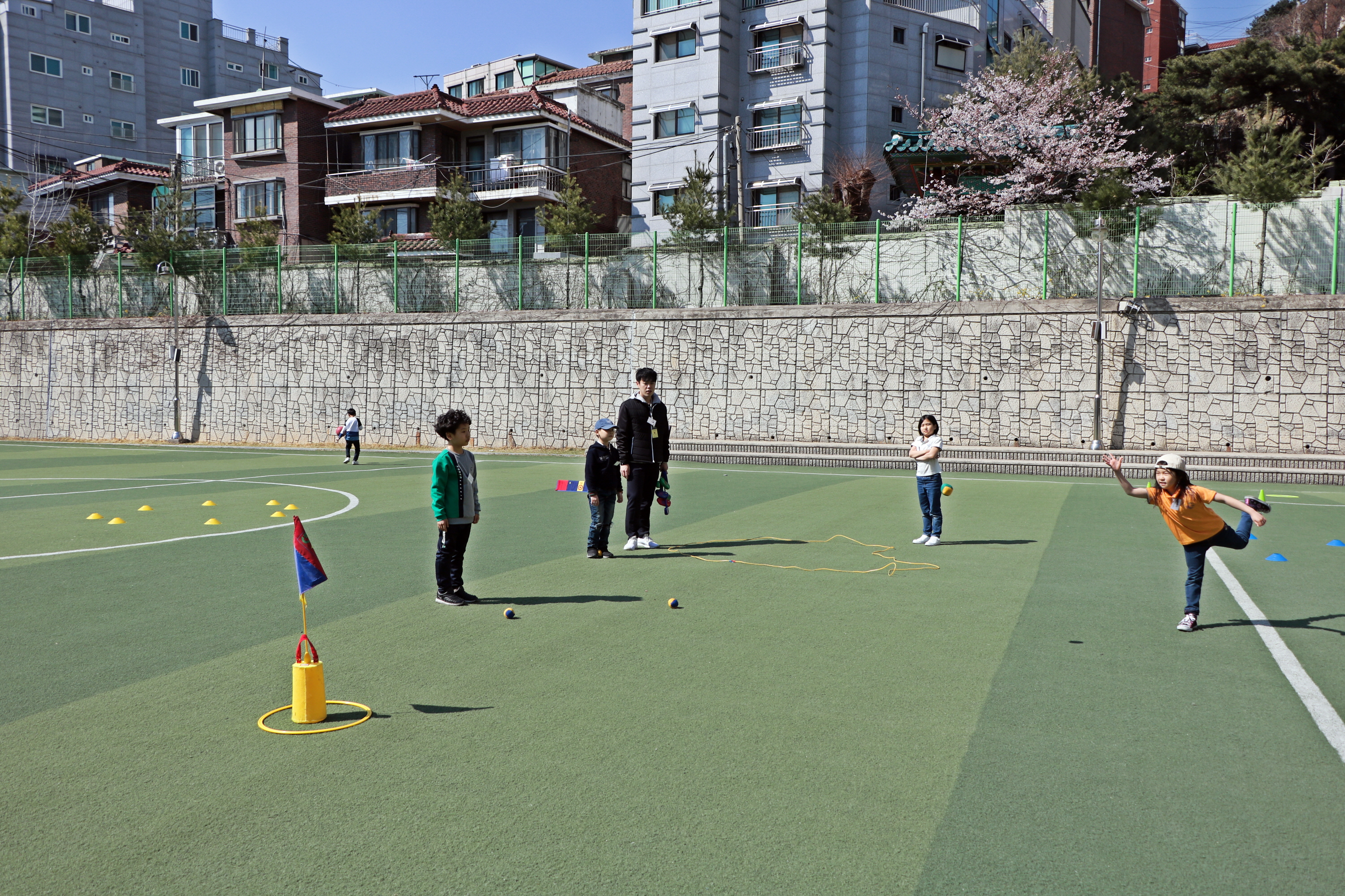 한마리 새가 나는 것처럼 신중하게 목표물을 향해 공을 던지는 교육생