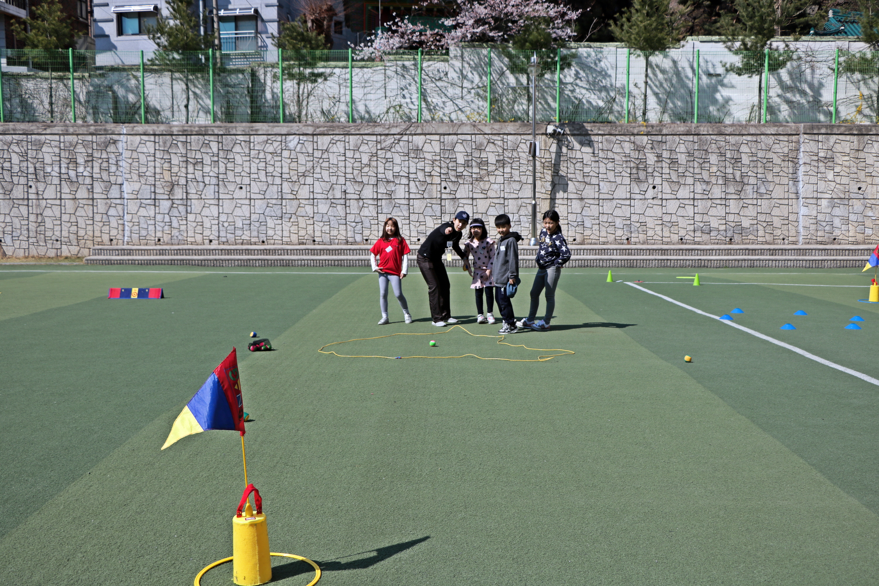 가상으로 만든 워터헤저드에 공이 들어간 교육생을 위해 실제로 이런 상황이 벌어졌을 때 어떻게 처리하는지를 알려주는 코치