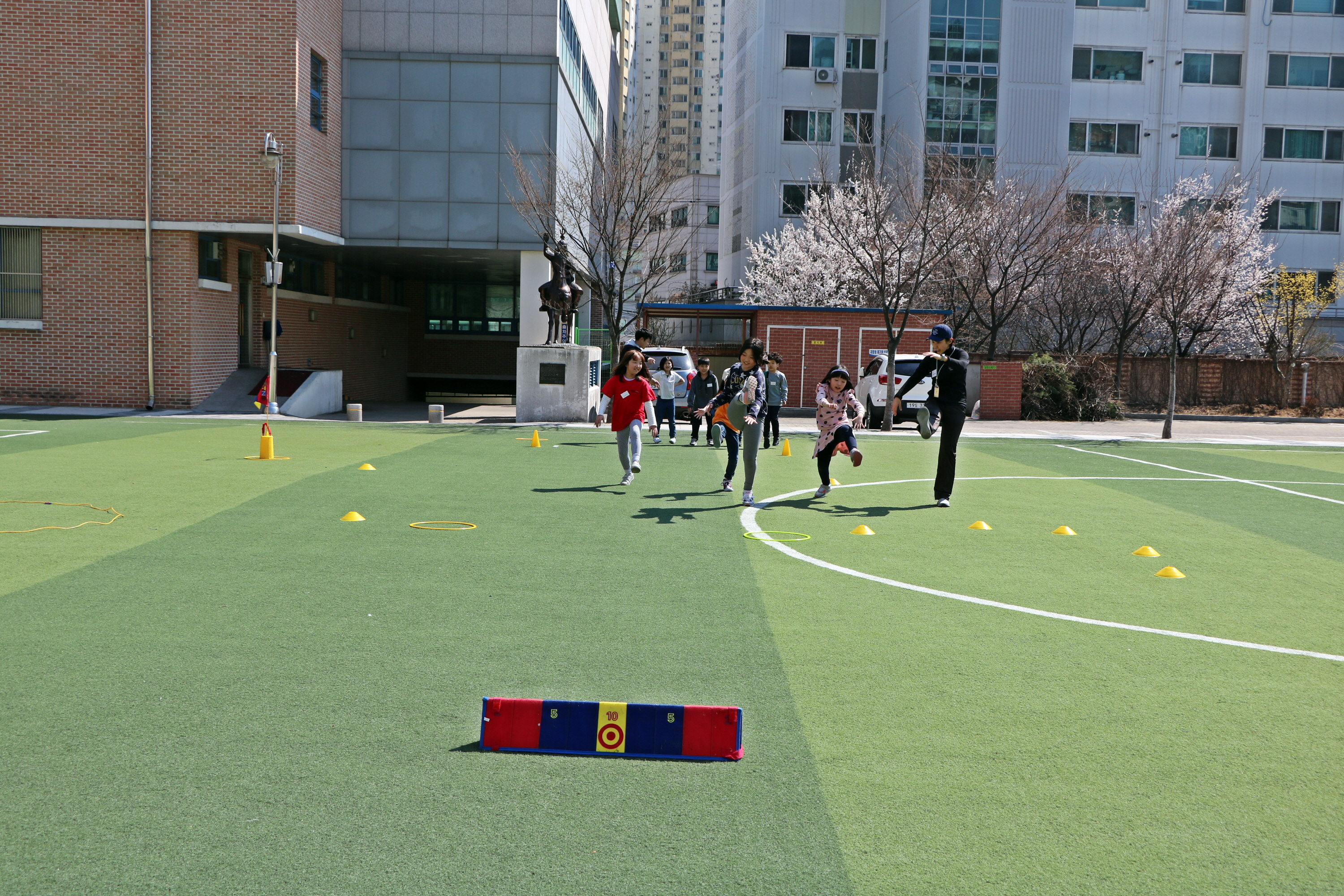 코치님의 구령에 맞춰 힘차게 발을 앞으로 차올리며 몸을 풀고 있는 모습