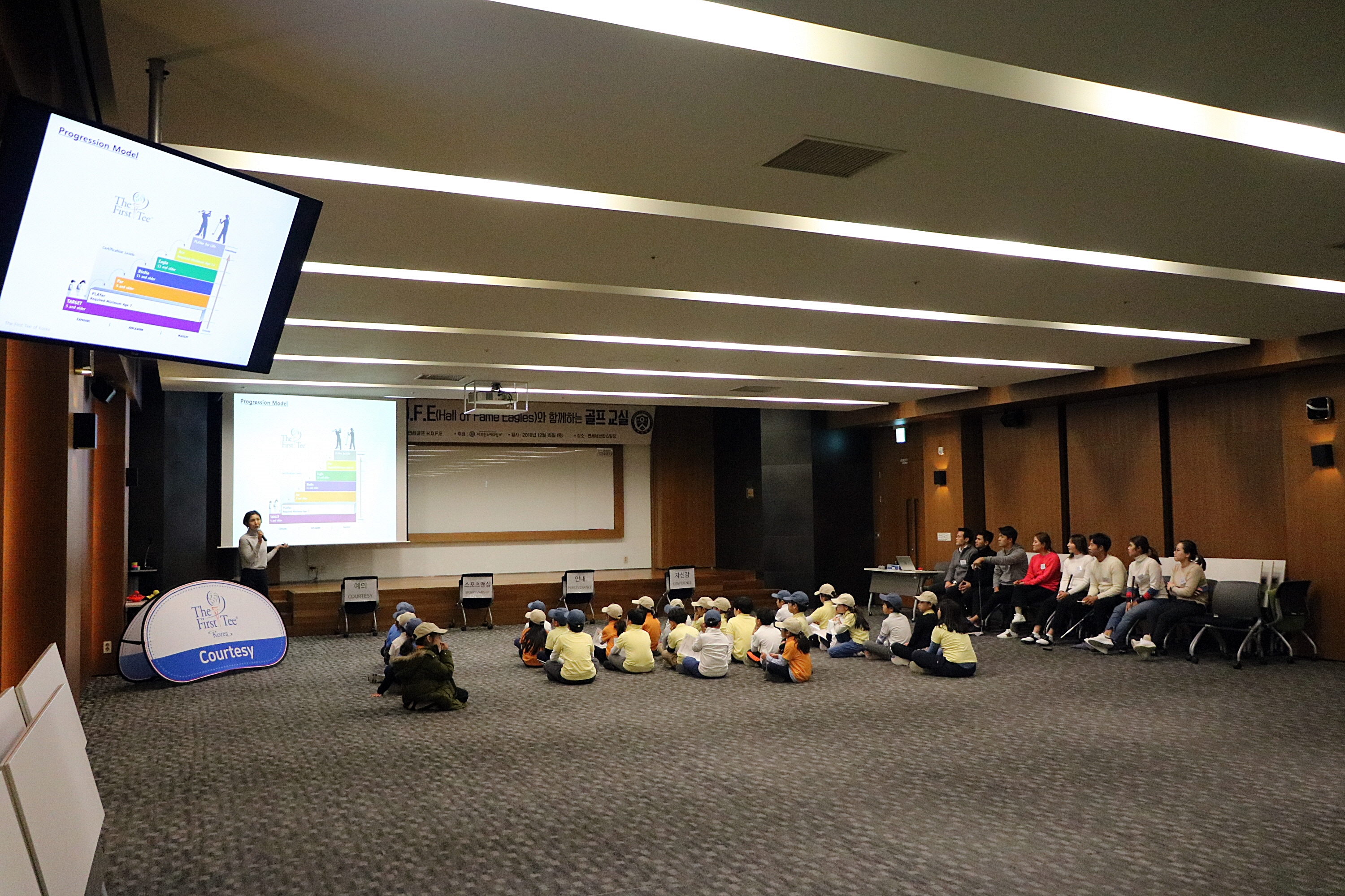 교육생과 부모님들께 다시 한번 더 퍼스트 티에 대한 간략한 소개를 해주고 있는 여지예 코치