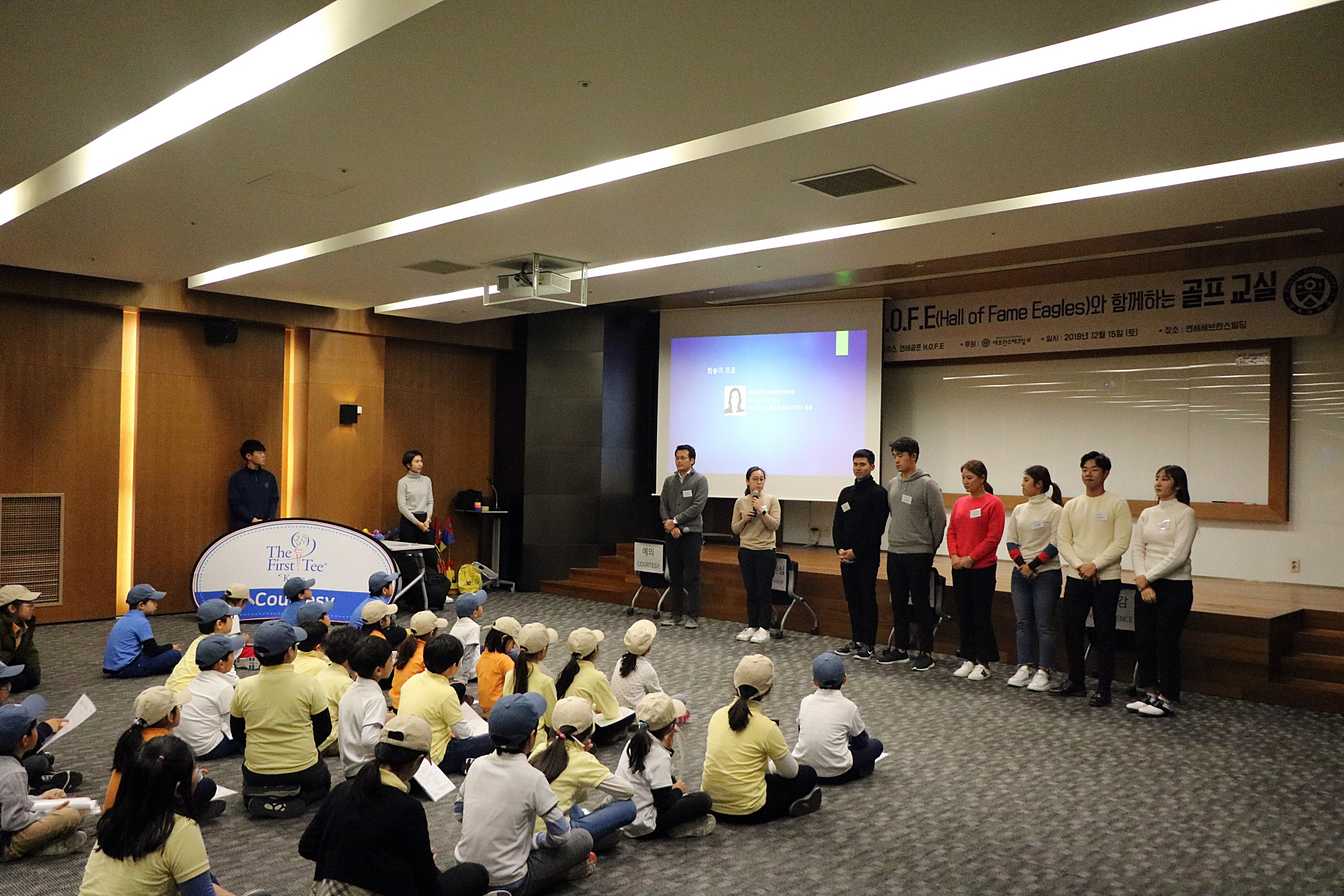연세대학교 골프부 출신 남, 녀 프로골퍼들의 모임인 H.O.F.E에 대한 소개를 하고 있는 모습