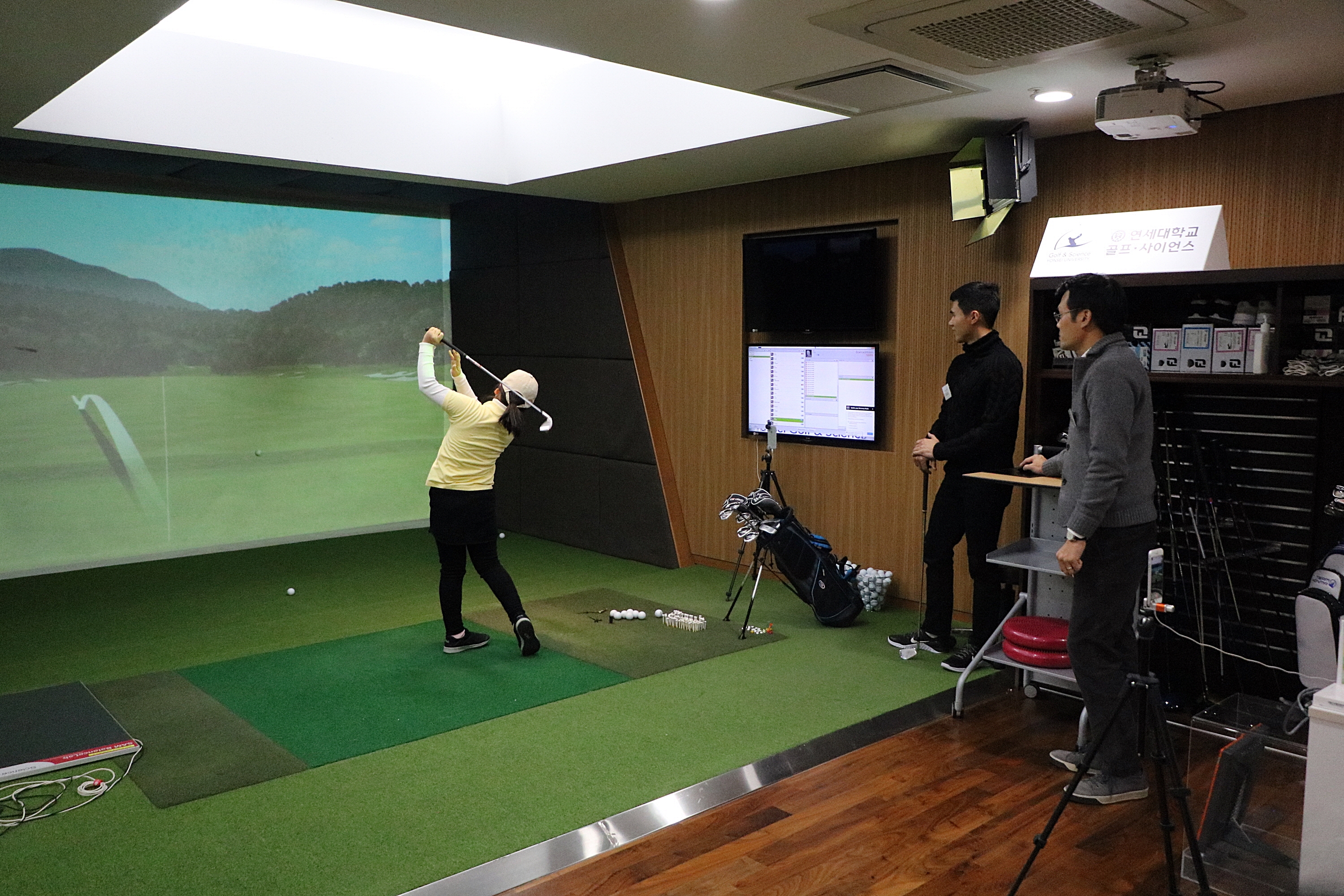 1/2,000초의 빠른 속도의 카메라로 골프스윙을 분석할 수 있는 시스템인 골프사이언스 시설을 체험해보고 있는 아이들