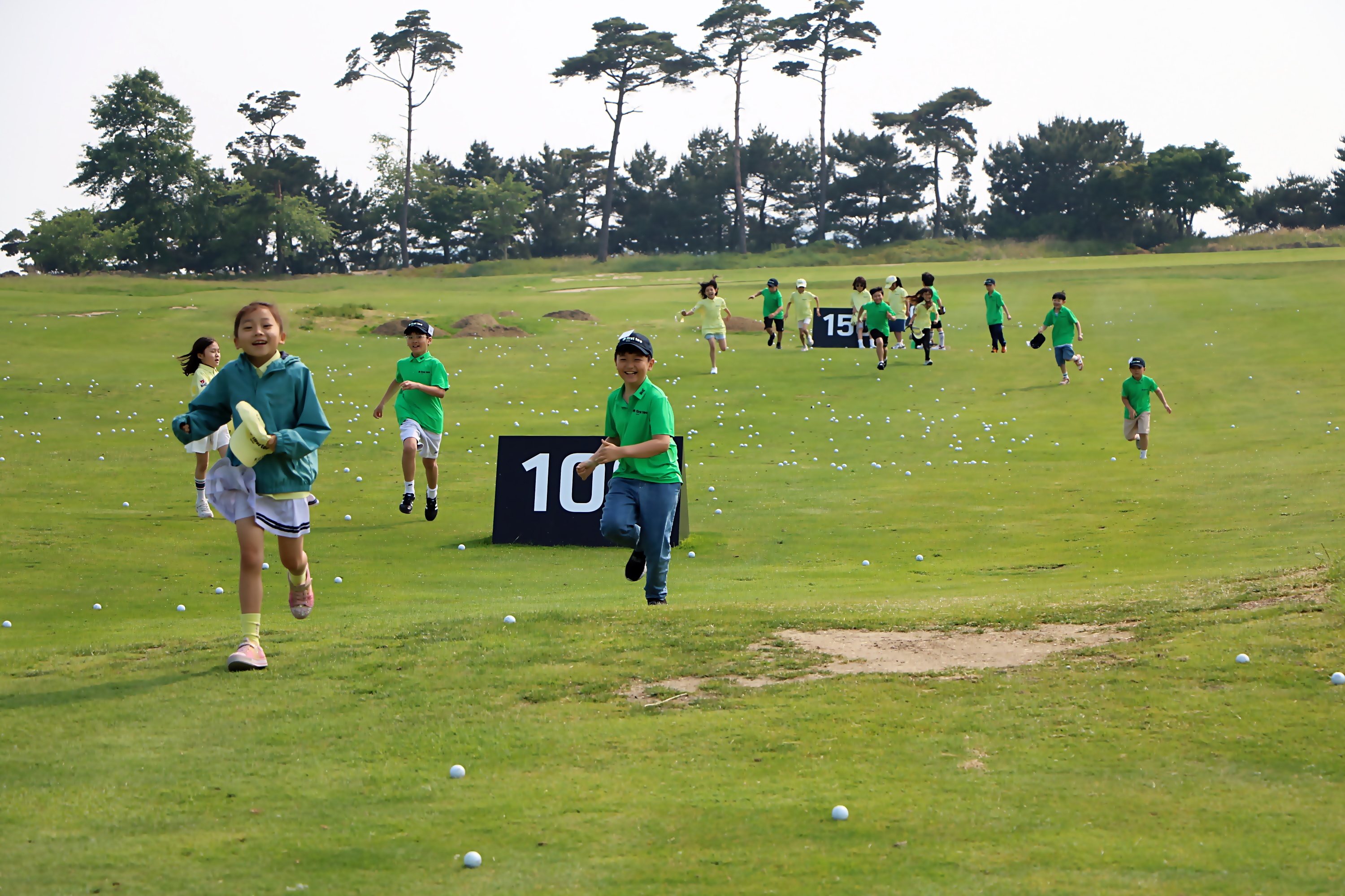 푸른 잔디 위에서 마음껏 달리기를 하며 즐거워하고 있는 아이들