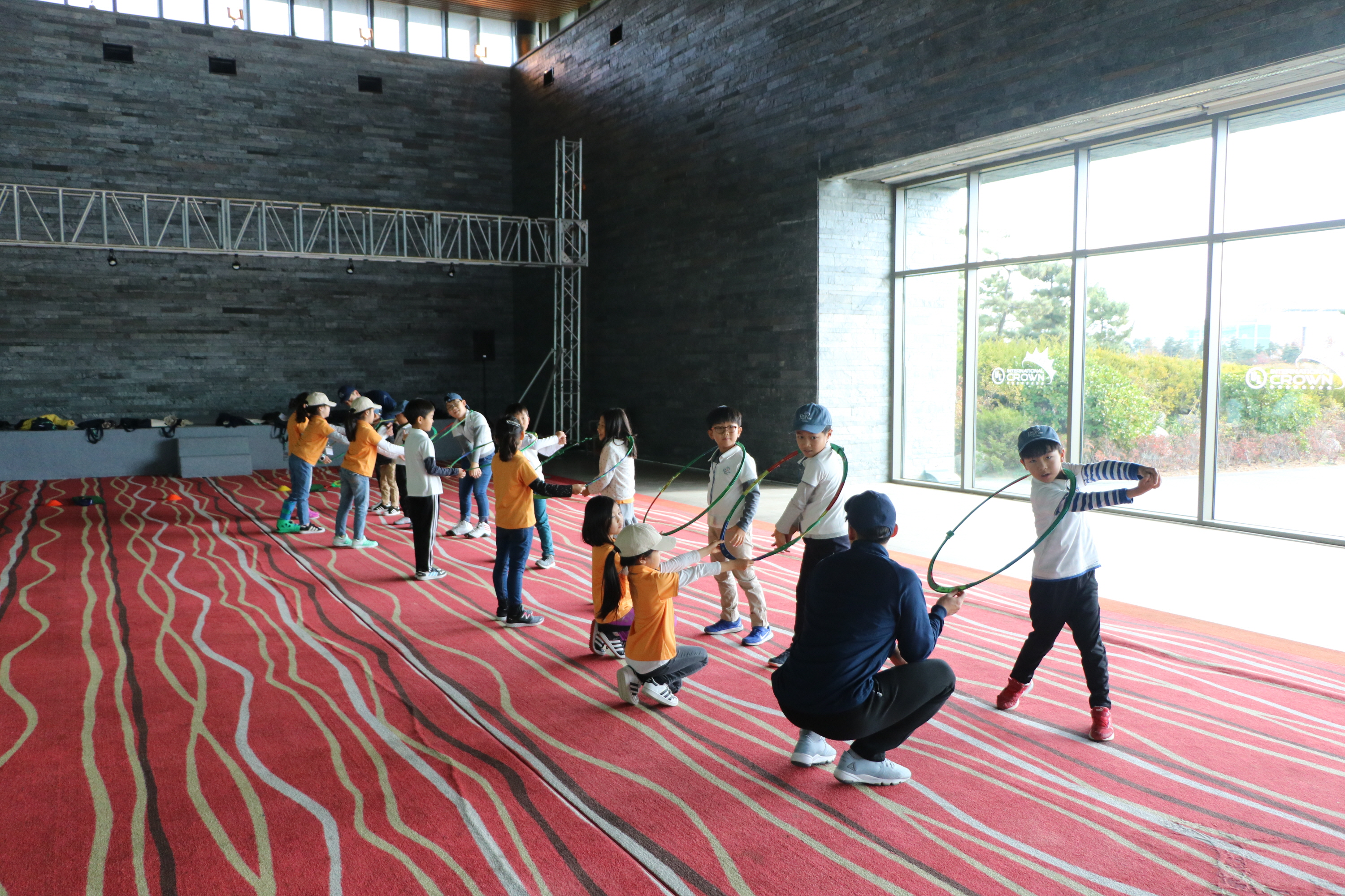 후프클락을 이용하여 이상적인 스윙궤도를 연습하는 교육생들
