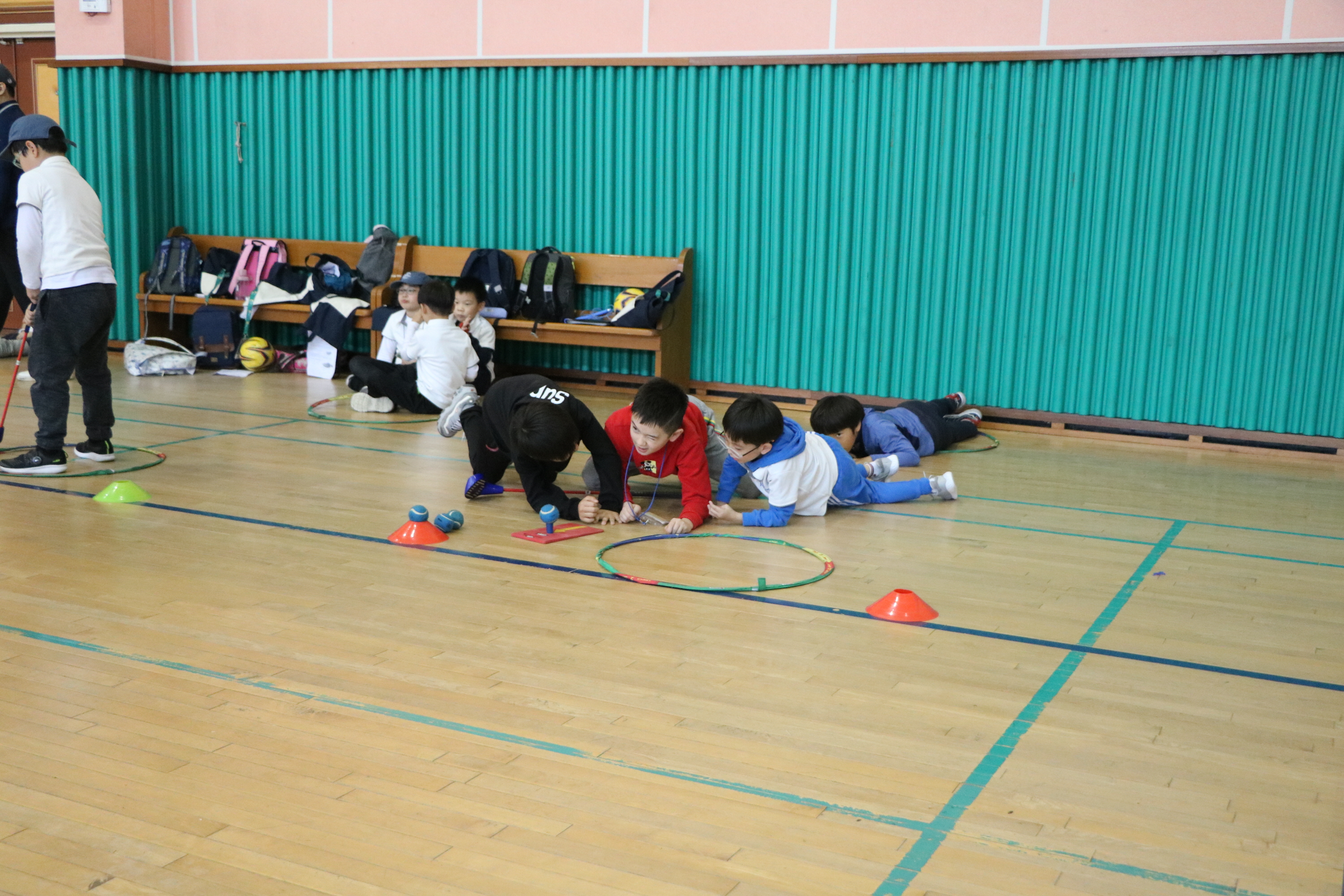 같은 팀 친구의 에이밍을 도와주는 학생들: 더퍼스트티 9가지 골프의 기본 중 '타겟설정'을 스스로 학습 중