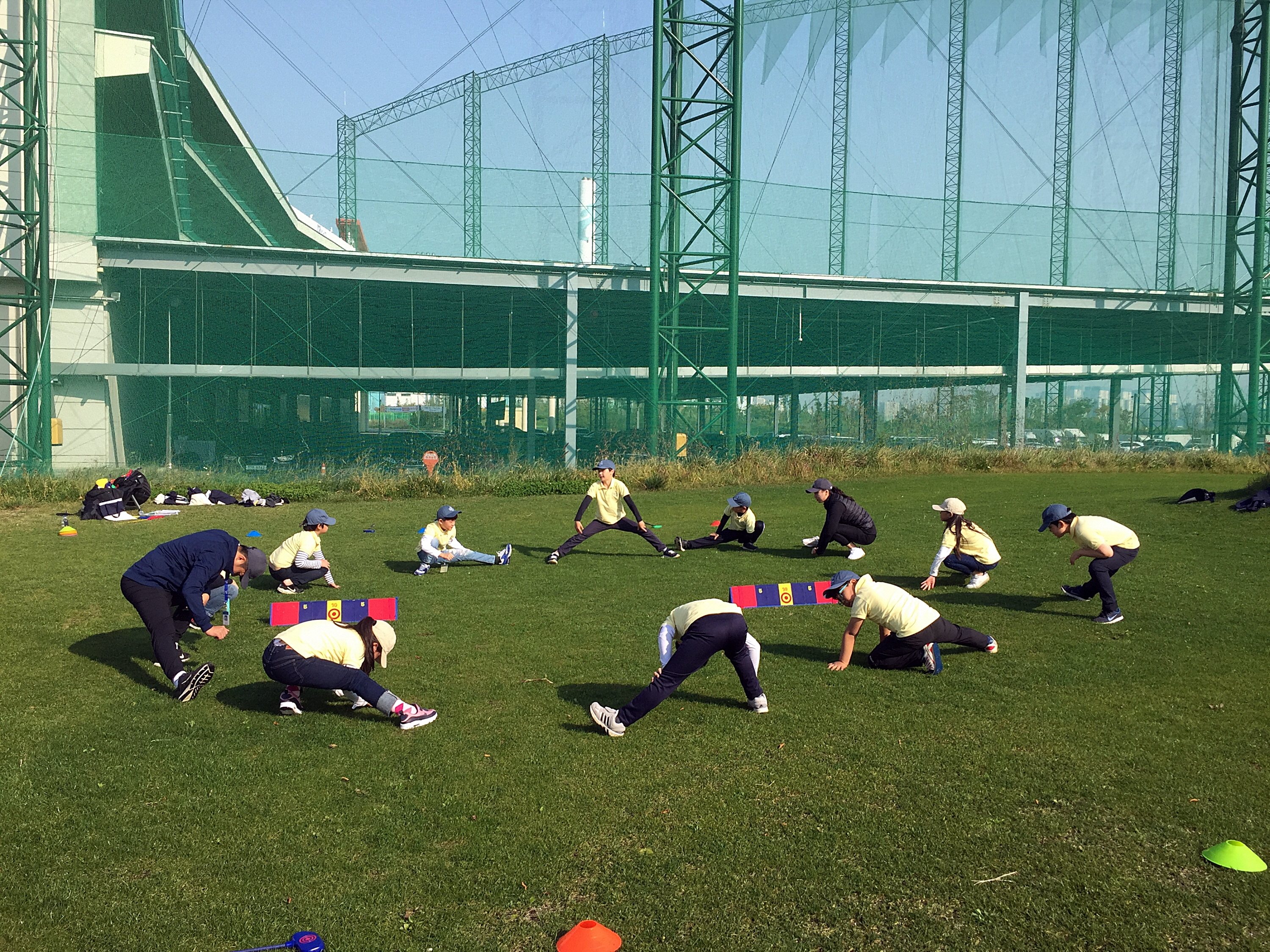 골프 실습 전 웜업으로 스트레칭을 하고 있는 교육생들의 모습